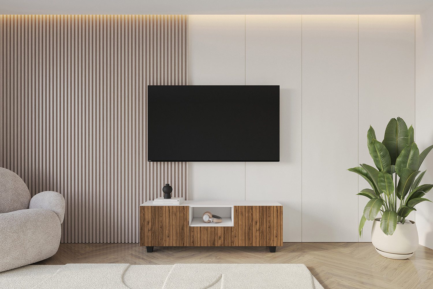 Die solide Möbelplatte garantiert Stabilität und eine lange Nutzungsdauer. Die eleganten Füße erleichtern das Staubsaugen unter dem Möbel und verleihen dem TV-Möbel eine moderne Optik.