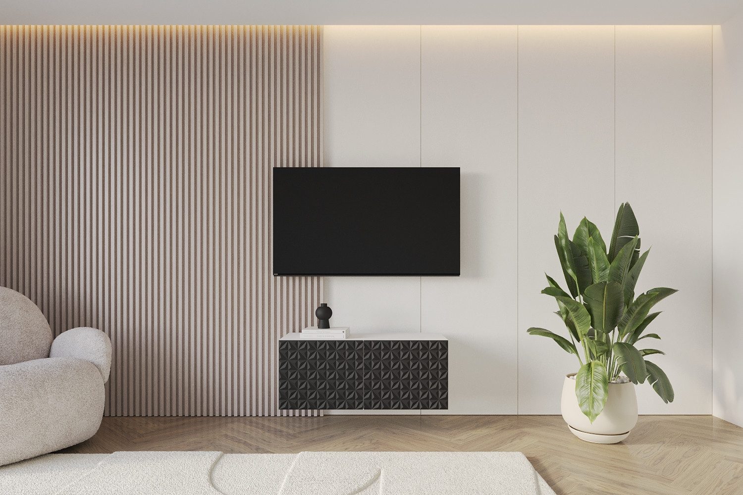 Die hängende TV-Kommode ist die perfekte Lösung für ein zeitgemäßes Raumkonzept, das den TV-Schrank zum Mittelpunkt des Wohnraums macht und eine elegante, edle Atmosphäre schafft. Das ansprechende Design des TV-Möbels überzeugt durch verschiedene Motive, Farben, pflegeleichte Materialien und sorgfältige Verarbeitung.