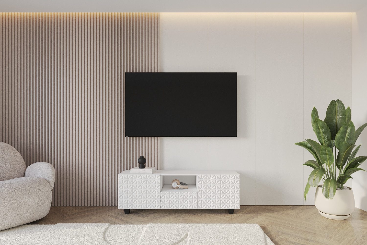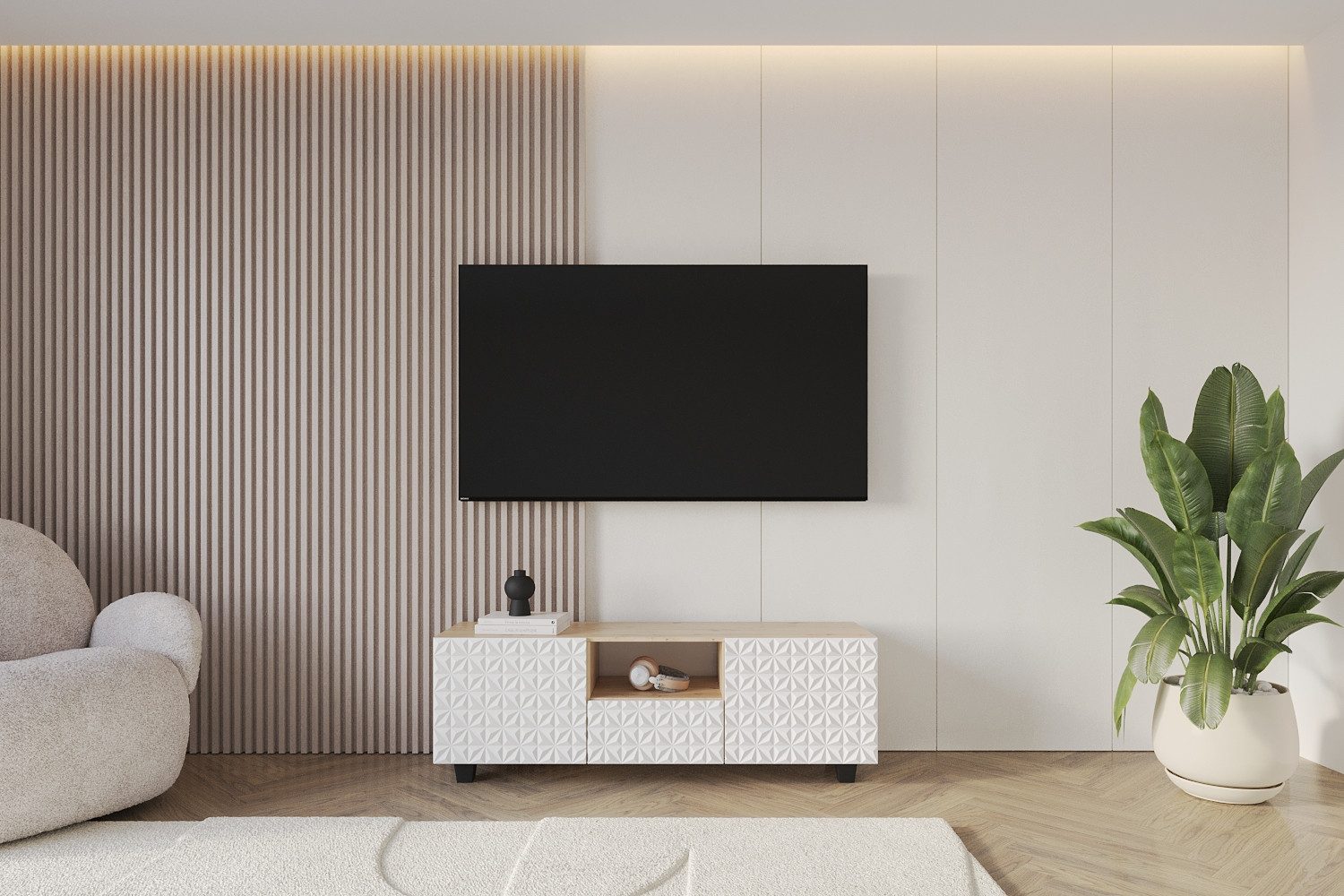 Die solide Möbelplatte garantiert Stabilität und eine lange Nutzungsdauer. Die eleganten Füße erleichtern das Staubsaugen unter dem Möbel und verleihen dem TV-Möbel eine moderne Optik.