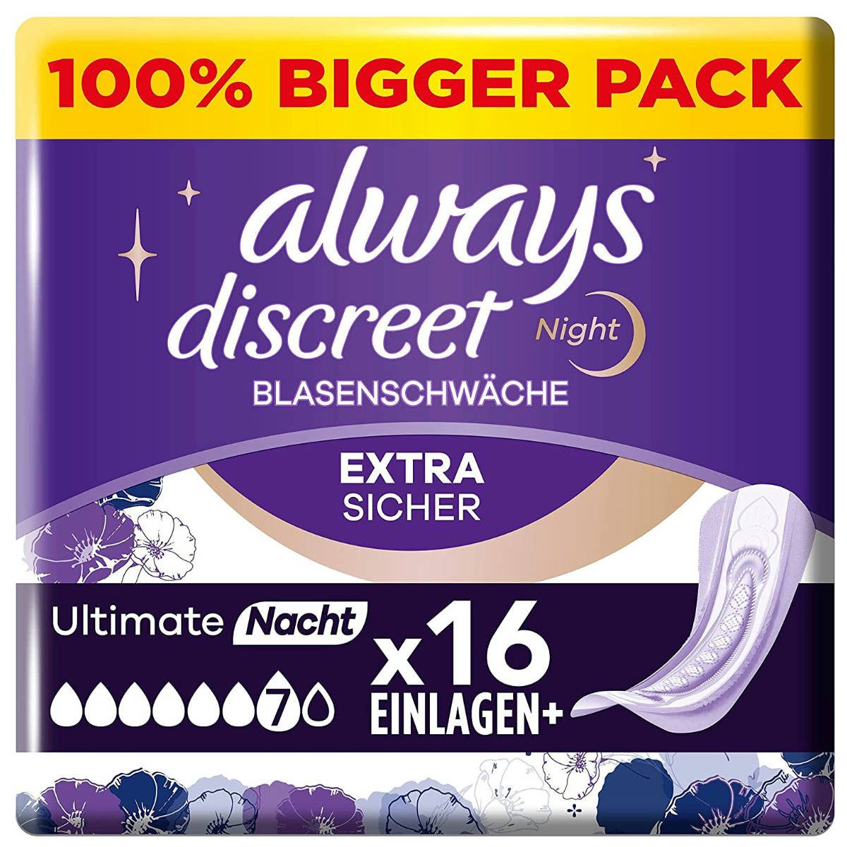 Always Discreet Ultimate Nacht sind extra sicher und bieten sehr starken Schutz, welchem Sie vertrauen können. Durch die zwei Schutzschichten verwandelt sich Flüssigkeit in Gel.