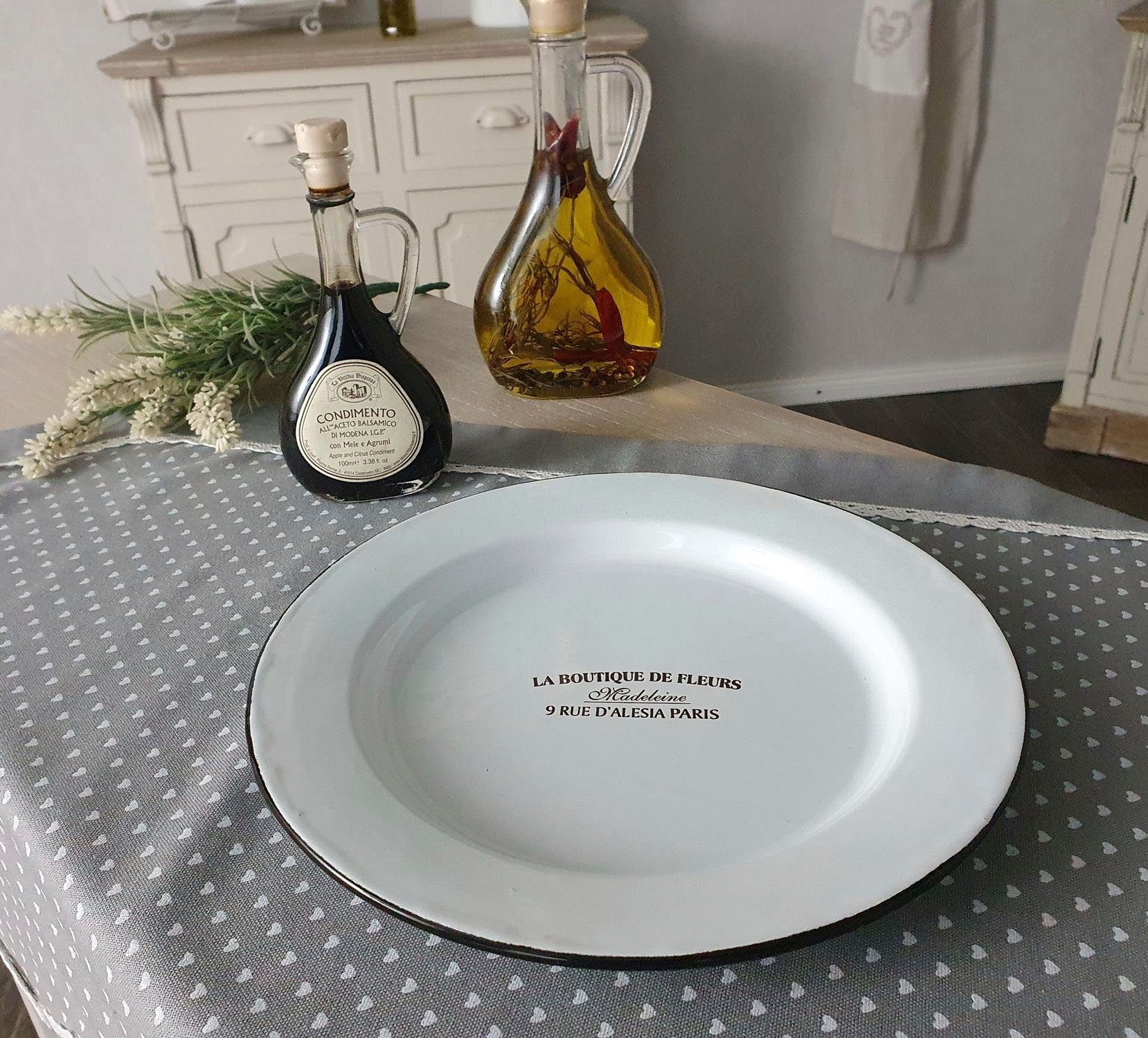 Mit unserer klassischen Teller aus Emaille schaffen Sie ein nostalgisches Ambiente in Ihrem Zuhause und haben gleichzeitig einen richtigen Hingucker für Ihre Gäste, wenn Sie ihn mit Chips & Co. befüllen. Die schöne, dekorative Servierteller wurde sorgfältig aus starkem Stahlblech gefertigt. Die originale Emaillebeschichtung wird entsprechend dem schon seit Jahrhunderten gebräulichen Verfahren hergestellt. Während dieses Herstellungsprozesses entstehen die kleinen Luftblasen und Abplatzungen in der Emaillebeschichtung - beides wesentliche Schlüsselmerkmale bei Produkten aus Emaille. Das Emaillierungsverfahren zum Schmelzen des Pulverglases auf Metall bei ungefähr 800 Grad wurde erstmals im 18. Jahrhundert angewendet. Die weiße Platte mit schwarzem, französischem Aufdruck ist klassisch mit der für Emaille typischen feinen, schwarzen Linie an den Rändern versehen. Die Teller ist rund und eignet sich auch hervorragend als Geschenkidee. Kombiniert mit zum Beispiel Pralinen... - Sie haben das perfekte Geschenk.