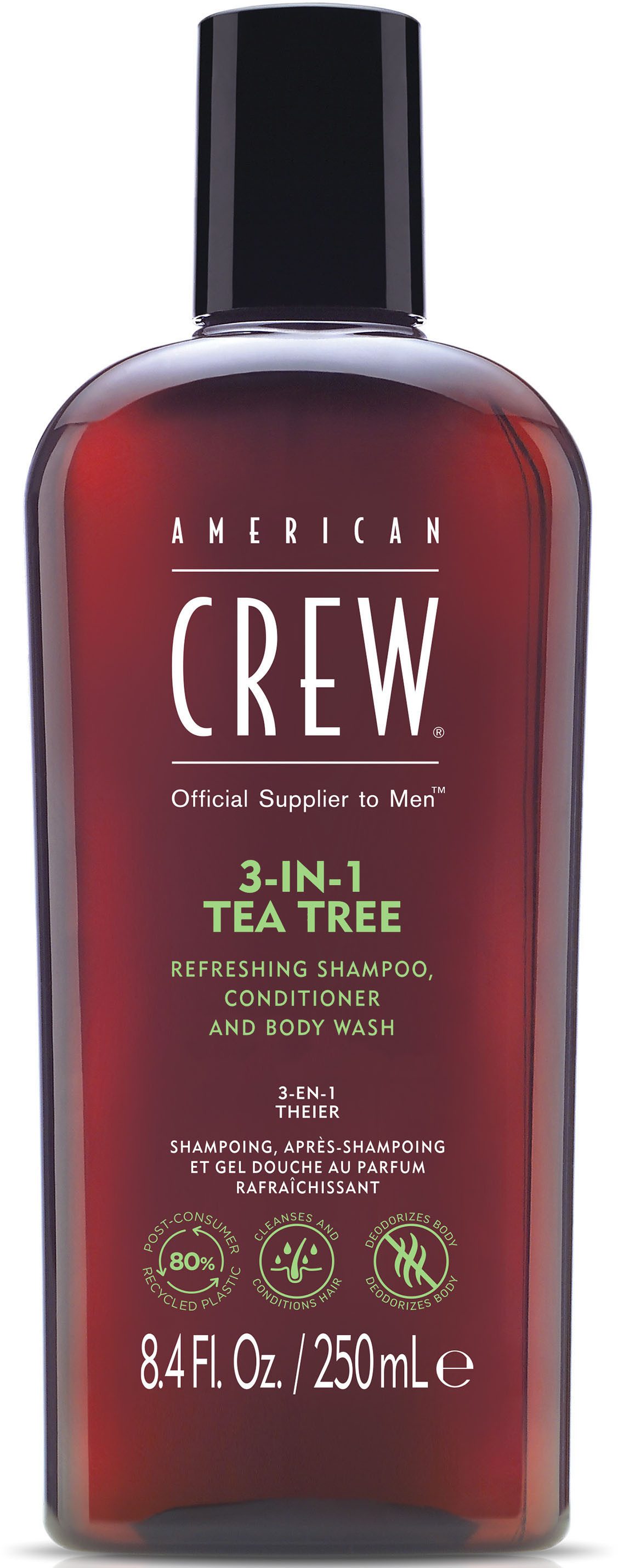 AMERICAN CREW – 3-in-1 Tea Tree Shampoo, Conditioner und Body Wash (250 ml): Das praktische Shampoo mit erfrischendem Duft von Teebaum vereint drei Pflegeprodukte in einem und schenkt Ihrer Männlichkeit die optimale Rundum-Pflege. Die leichte Formel des Pflegeshampoos verleiht dem Haar nicht nur ein angenehmes Tragegefühl, sondern reinigt sowohl den Körper, als auch die Haare und Kopfhaut sanft und effektiv. Das 3-in-1 Shampoo ist für jeden Haartyp geeignet und ideal für alle Männer, die Wert auf ein stilvolles Äußeres legen. Es pflegt Haar und Kopfhaut ohne zu beschweren und entfernt überschüssiges Fett sowie Unreinheiten, während es die Körperhaut remineralisiert und ihr Geschmeidigkeit verleiht. Zudem entwirrt es und sorgt für einen natürlichen Glanz gepflegter Männerhaare. Dank der 3 in 1 Eigenschaften ist das Produkt zudem der ideale Begleiter für unterwegs. Einfach eine großzügige Menge des Hair & Body Shampoos auf dem nassen Haar und Körper auftragen und gründlich abspülen. Verschaffen Sie Ihrer Frisur die perfekte Pflege für einen natürlichen Look – jeden Tag. American Crew ist speziell auf die besonderen Bedürfnisse und Pflegegewohnheiten von Männern zugeschnitten und steht u.a. für einzigartig männliche Düfte, die jeden begeistern, individuell passende Stylingprodukte und perfekt aufeinander abgestimmte Pflegeprodukte. Sorgfältig und konsequent bietet American Crew Pflege- und Stylingprodukte für jeden Mann und sorgt so täglich für eine hohe Performance, das perfekte Styling und erfrischende sowie pflegende Ergebnisse. Speziell entwickelte Formeln für die besonderen Bedürfnisse von Männerhaaren schaffen mehr Kraft und mehr Fülle für mehr Style und einen individuellen Look. AMERICAN CREW – THE OFFICIAL SUPPLIER FOR MEN.