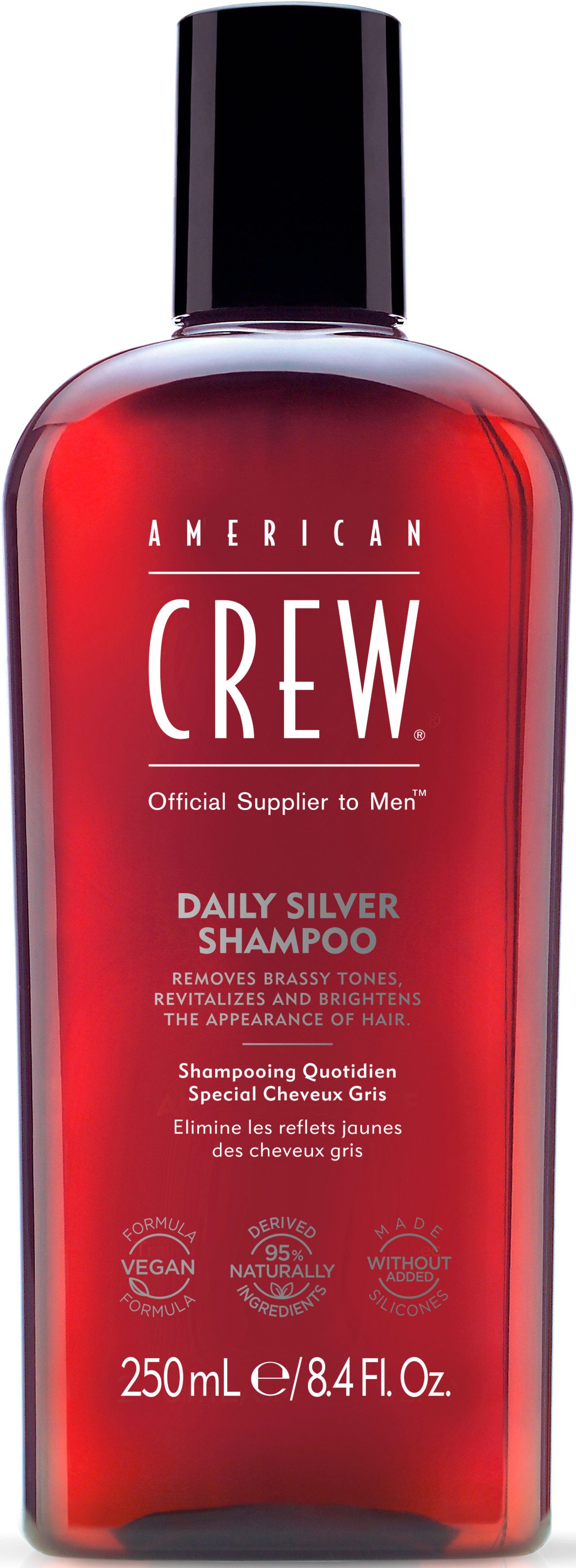 AMERICAN CREW – Daily Silver Shampoo Mit diesem Haarshampoo unterstreichen Sie Ihre Männlichkeit mit der optimalen Pflege. Die leichte Formel des professionellen Pflegeshampoos schenkt Ihrem Haar nicht nur ein angenehmes Tragegefühl, sondern sorgt auch für den natürlichen Glanz gesund aussehender Haare. Das American Crew Daily Silver Shampoo ist speziell für graue Haare geeignet und ideal für alle Männer, die Wert auf ein stilvolles Äußeres legen. Das Shampoo wirkt dem Gelbstich grauer und weißer Haare entgegen, schützt coloriertes oder blondiertes Haar vor dem Austrocknen und verleiht zudem optimale Feuchtigkeit durch hydrolysierte Milchproteine. Verschaffen Sie Ihrer Frisur die perfekte Pflege und Geschmeidigkeit für Ihren natürlichen Look – jeden Tag. American Crew ist speziell auf die besonderen Bedürfnisse und Pflegegewohnheiten von Männern zugeschnitten und steht u.a. für einzigartig männliche Düfte, die jeden begeistern, individuell passende Stylingprodukte und perfekt aufeinander abgestimmte Pflegeprodukte. Sorgfältig und konsequent bietet American Crew Pflege- und Stylingprodukte für jeden Mann und sorgt so täglich für eine hohe Performance, das perfekte Styling und erfrischende sowie pflegende Ergebnisse. Speziell entwickelte Formeln für die besonderen Bedürfnisse von Männerhaaren schaffen mehr Kraft und mehr Fülle für mehr Style und einen individuellen Look. AMERICAN CREW – THE OFFICIAL SUPPLIER FOR MEN.