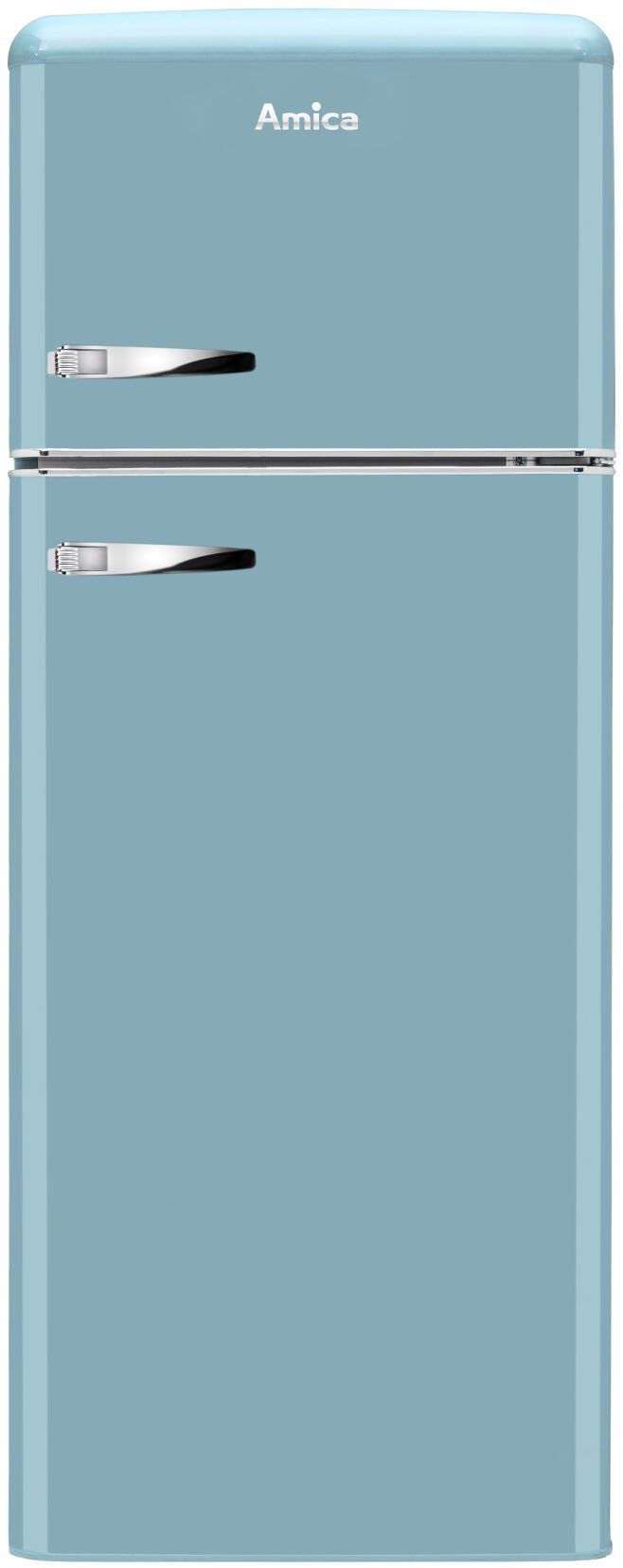 Die Kühl- und Gefrierkombination »DTR 374 190 T« ist von der Marke Amica und freistehend. Bei einem Gefriervolumen von 44 l und Kühlvolumen von 162 l betragen die Maße des Modells 55 x 144 x 61,5 cm (B/H/T). Das Modell arbeitet mit einem Betriebsgeräusch von 39 dB. Eine Gemüseschublade steht zur Verfügung, um die Lebensmittel zu verstauen. Auf vier Ablageflächen aus Glas ist in der Kühl- und Gefrierkombination genug Raum für Lebensmittel. Schnell griffbereit sind Lebensmittel in den drei Türablagen. Всеs im Blick hat man außerdem dank der LED-Innenbeleuchtung. Die »DTR 374 190 T« von Amica ist eine Kühl- und Gefrierkombination, die mit ihren Features überzeugt und ausreichend Platz für Lebensmittel aller Art bietet.