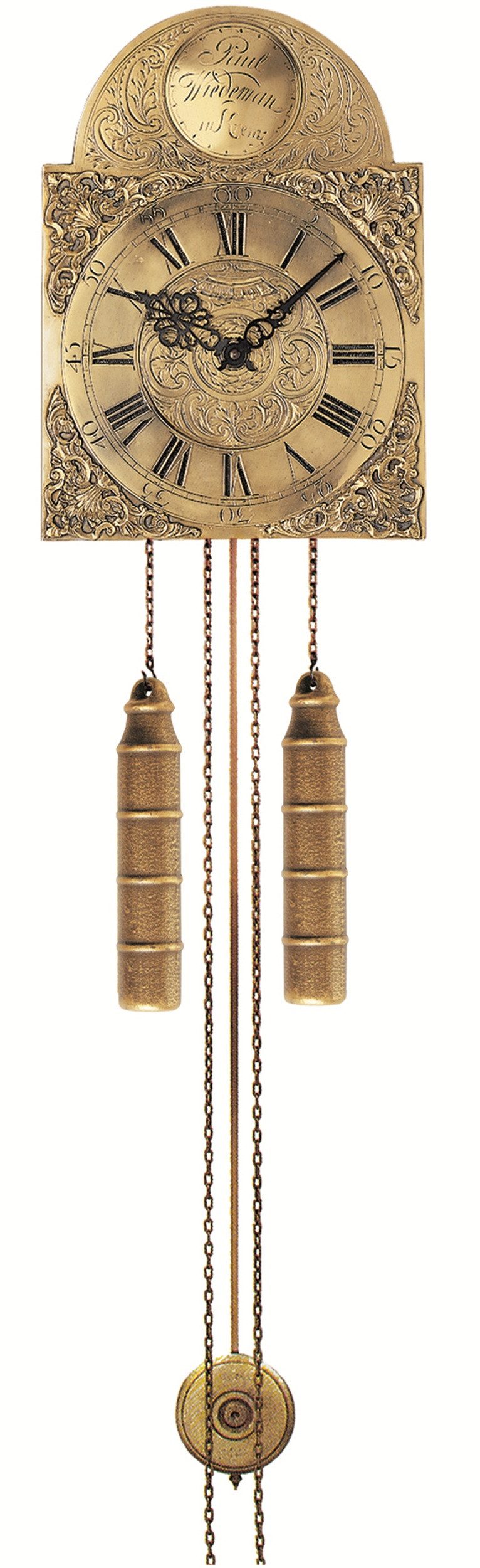 Das kunstvoll gestaltete Zifferblatt trägt römische Ziffern und filigrane Zeiger, eingerahmt von dekorativen Verzierungen. Goldfarbene Gewichte und feine Pendelketten runden den majestätischen Eindruck ab. Jedes Detail zeugt von Präzision und Hingabe – Eigenschaften, die in einer Zeit mechanischer Massenfertigung besonders wertvoll sind.