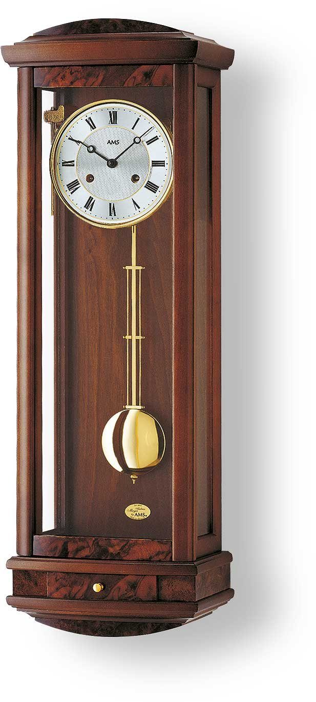 Die AMS 607/1 ist eine edle Wanduhren im Stil eines traditionellen Regulators und verbindet klassisches Design mit feinster Mechanik. Gefertigt aus hochwertigem Nussbaumholz, präsentiert sich diese Pendeluhr mit einem silberfarbenen Zifferblatt, römischen Zahlen und einem eleganten, goldfarbenen Pendel. Eine dezente Besonderheit ist die kleine Schublade im unteren Teil des Gehäuses – ein dekoratives und zugleich praktisches Detail.