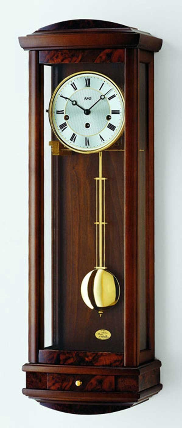 AMS 2607/1 ist eine elegante Wanduhr für Liebhaber traditioneller Uhrmacherkunst. Diese mechanische Pendeluhr verbindet hochwertiges Handwerk mit einem harmonischen Klangbild und verleiht jedem Wohnraum eine warme, klassische Note. Das fein verarbeitete Gehäuse aus edlem Nussbaumholz macht sie zu einem stilvollen Hingucker – besonders in klassisch eingerichteten Wohnzimmern oder repräsentativen Räumen.