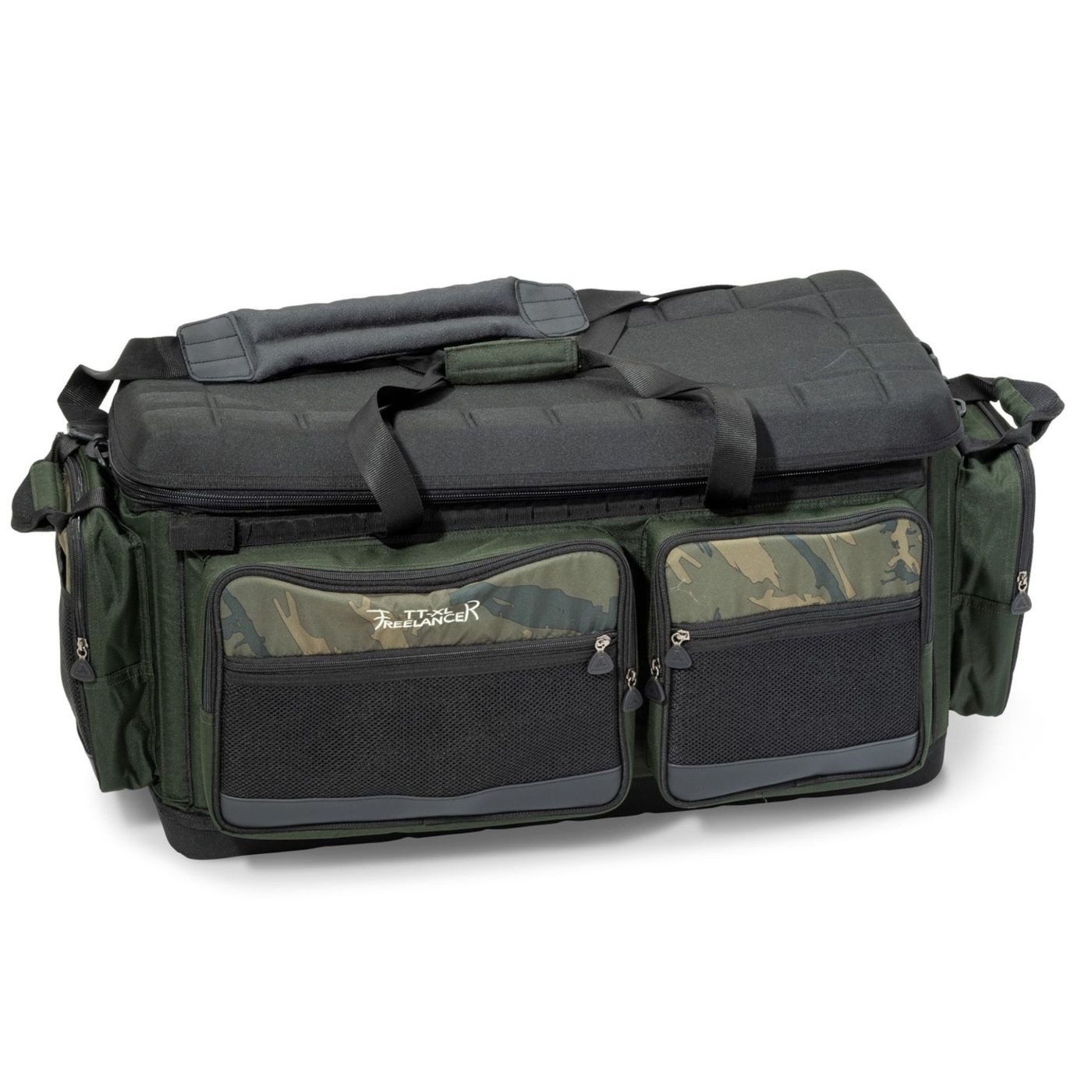 ANACONDA Freelancer Tackle Treasure XLargel - Die Freelancer Tackle Treasure XLarge von Anaconda ist eine Karpfentasche im Freelancer Camo-Look. Sie bietet nicht nur versteifte Seitenteile, sondern auch einen, aus festem Material gefertigten, Deckel, der den Eindruck einer Truhe erweckt. In den Vortaschen finden ein Tackle Chest M und ein Tackle Chest L ihren Platz. Das Freelancer Tackle Treasure XL verfügt über zusätzliche Außentaschen und die Haupttasche kann mit Trennwänden, die einfach mittels Klett befestigt werden, individuell unterteilt werden. Die Tasche ist außerdem mit seitlichen Tragegriffen, einem Haupttragegriff und einem Schultergurt ausgerüstet. Mit Außenmaßen von 90 x 42 x 39 cm bietet sie viel Stauraum. Der Hartschalendeckel kann als Tisch verwendet werden. Hergestellt aus robustem Material und ausgestattet mit einer wasserabweisenden Beschcihtung, besticht die Tasche durch ihre moderne Freelancer Camo Optik.