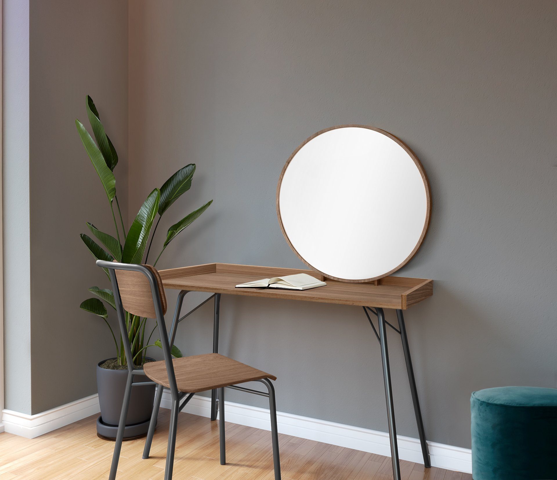Dieser Schminktisch von andas begleitet dich beim morgendlichen Frisieren und Stylen, aber auch beim Abschminken am Abend. Mit dem runden Spiegel hast du deinen ganz persönlichen Ort, an dem du dich in Ruhe fertig machen kannst.