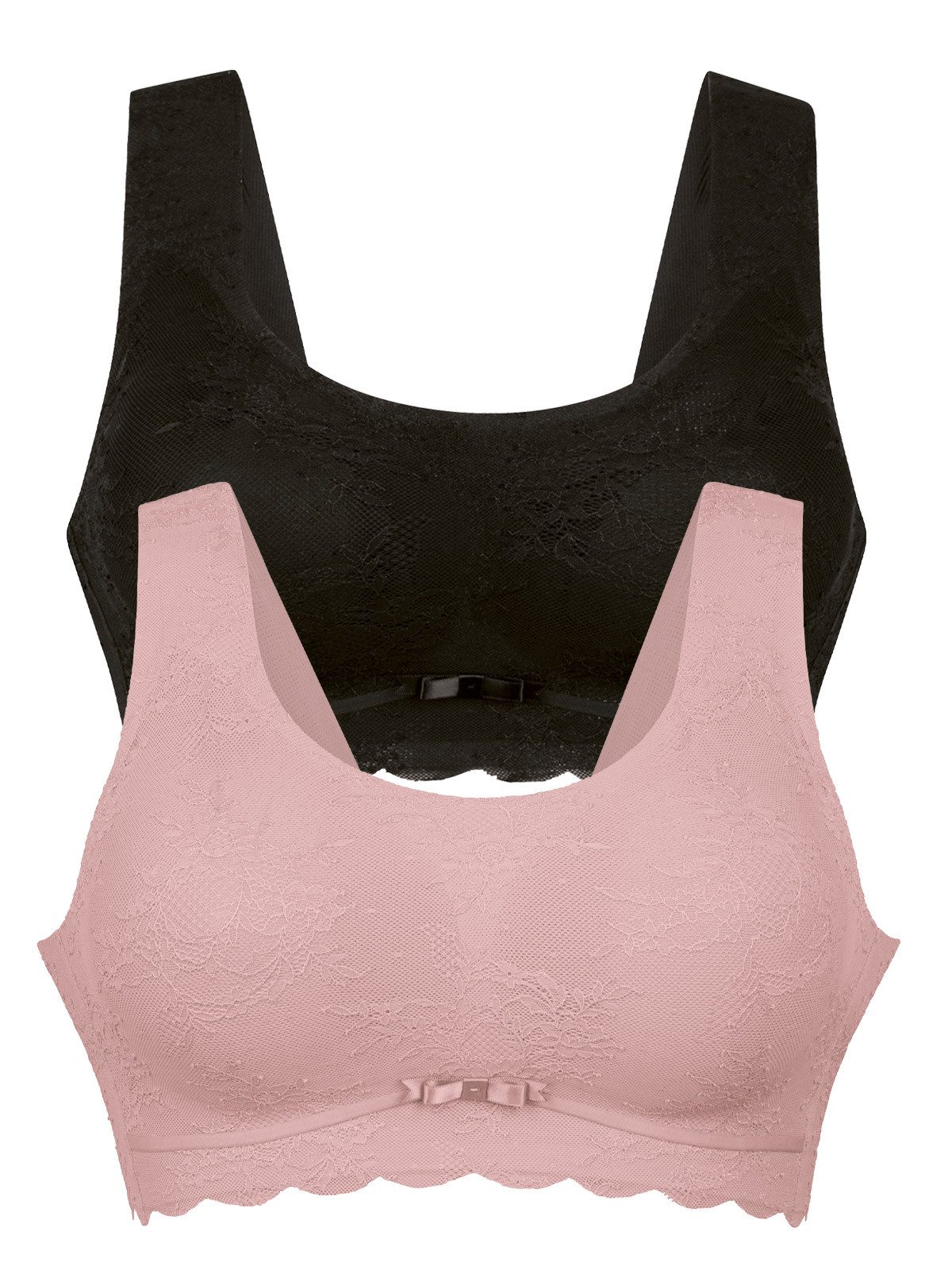 Ultra-bequemes Bralette im lässig, natürlich und femininen Style. Gemoldete Cups ergänzend durch herausnehmbare, leicht gepolsterte fein perforierte Schaumschale. Innen komplett gefüttert mit gelochter atmungsaktiver Wohlfühl-Ware. Bügelloser Halt, kaschierend und kombiniert mit floraler Spitzenoptik, verziert mit einem zarten Seidenband. Komfortable, breite und verstärkte Träger. Im Rücken 4-fach verstellbar!