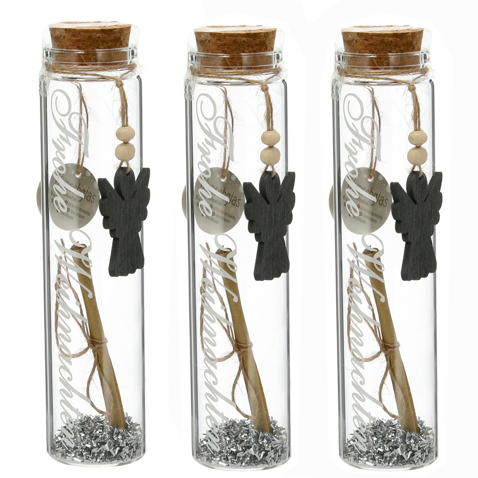 Tolles Wunschglas mit Aufdruck "Frohe Weihnachten" für Geldgeschenke. Die Glasröhrchen sind liebevoll mit Korken zum Verschließen und aufwendig mit Schutzengelanhänger gearbeitet. Die Geldgeschenk-Verpackung ist ideal zum Verschenken von Weihnachtsgeld oder Gutscheinen. Geldgeschenke sind äußerst beliebt, man muss weder einen Kassenbon отменить noch was umtauschen, auch gibt es keine enttäuschten Gesichter. Im Glas befindet sich dekorativer Wunschstaub. Maße: Glas und Korken Maße: H 15,5 cm - Ø 3,5 cm Lieferumfang: 3 Stück