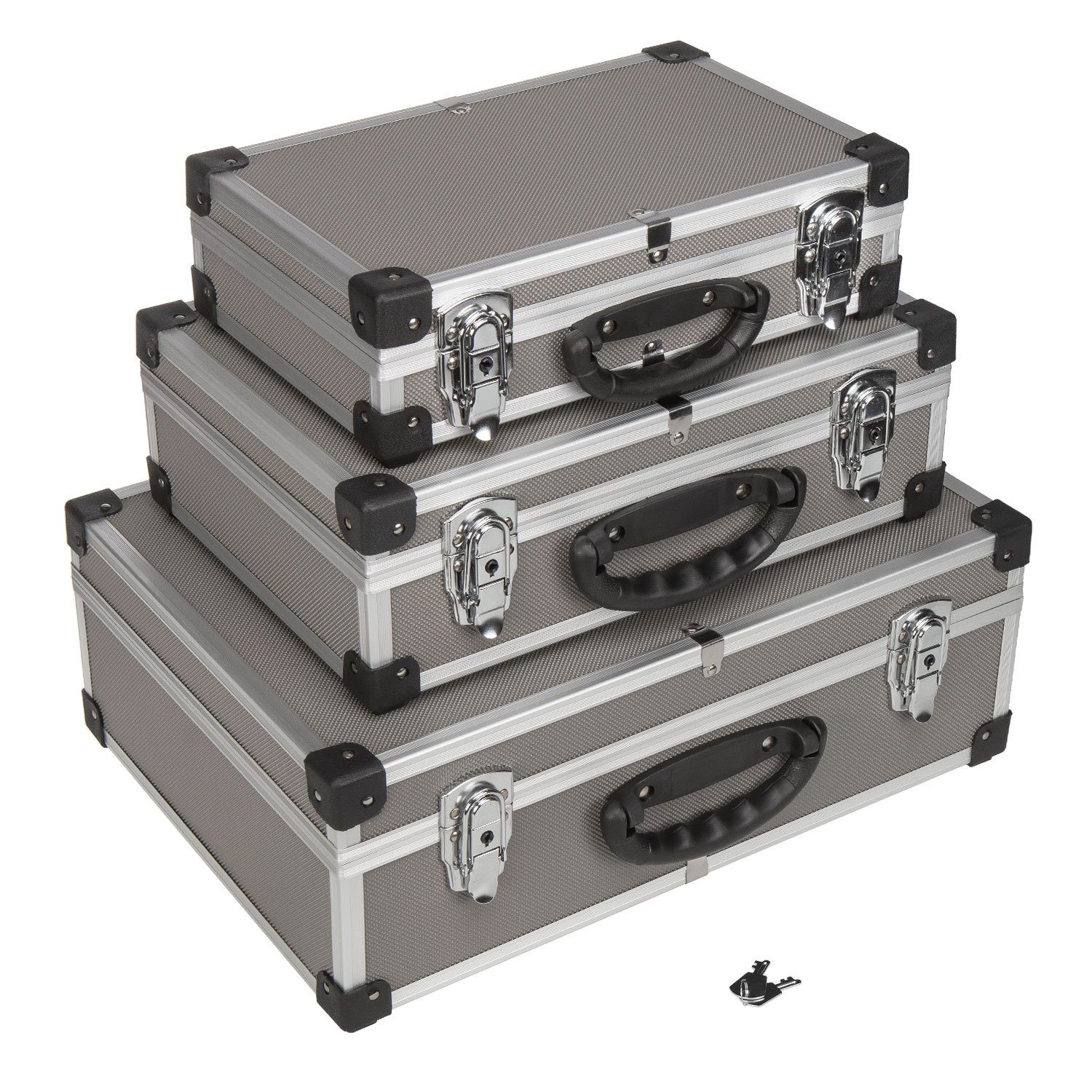 Extra stabiler Alukoffer für Transporte oder Präsentationen. Zur individuellen Aufbewahrung von Werkzeug, Messgeräten, Laptops, Münzen, Sammlungen und vielem mehr. Der robuste Alukoffer ist mit grauem Moosgummi ausgeschlagen. Die Koffer sind ineinander stapelbar für ein platzsparendes Verstauen beim Nichtgebrauch. Die Kanten sind mit glattem Aluminium und die Ecken zusätzlich mit Hart-Kunststoff verstärkt. Die silbernen Scharniere sind gut verarbeitet und versprechen eine lange Lebensdauer. Durch das Schloss, welches in den Arretierungsverschluss eingearbeitet ist, sind alle Koffer abschließbar.