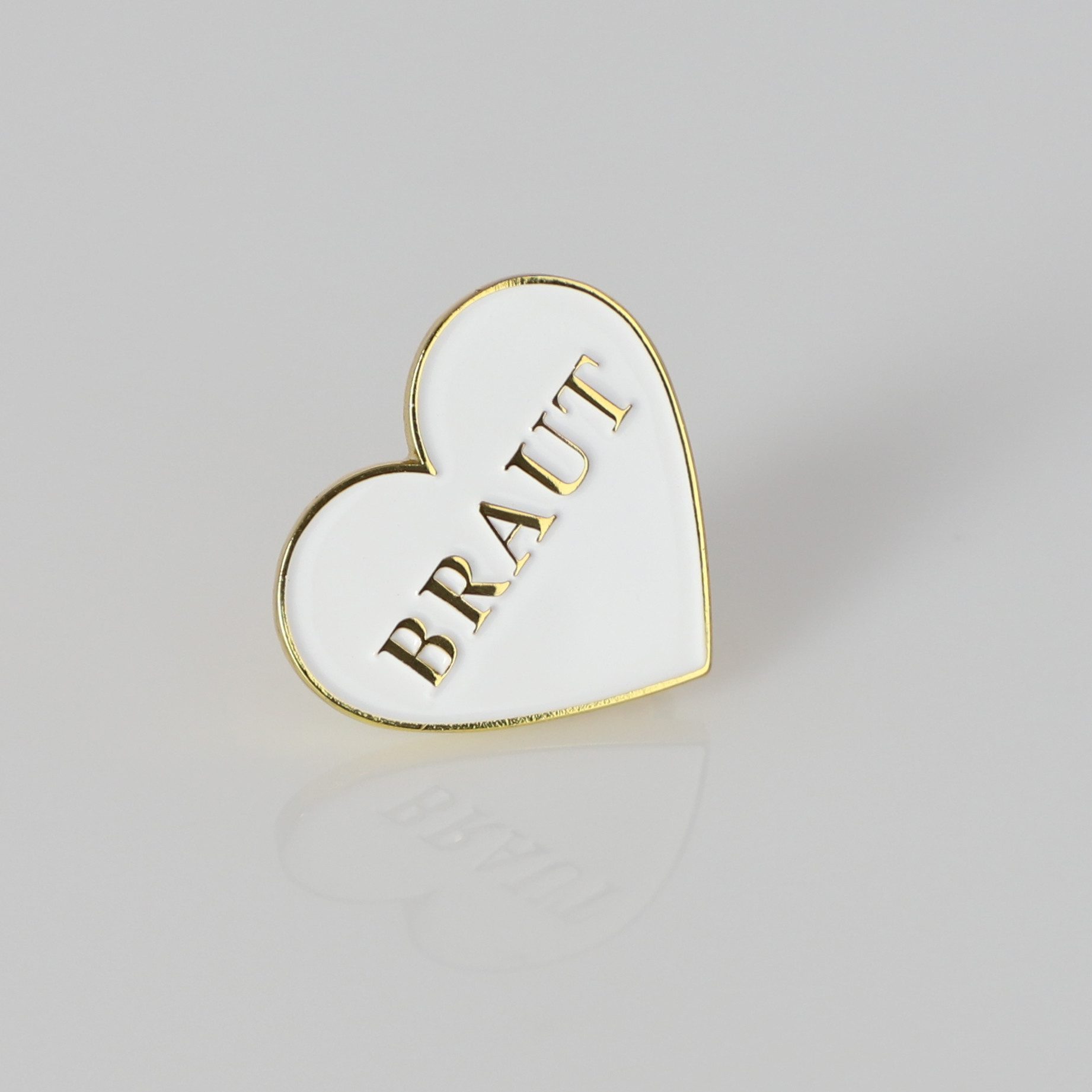 Hochwertig verarbeiteter Ansteck-Pin "Braut" als perfektes Accessoire für die Braut - ob zum Junggesellinnenabschied, zur Jacke zum Brautkleid oder an einer Handtasche.