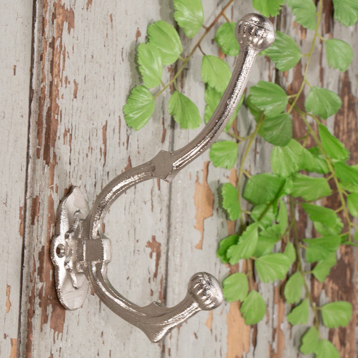 Dieser schön designte Kleiderhaken aus silber lackiertem Eisen mit einem schönen verziertem Motiv eignet sich sehr gut als Flurgarderobe. Er ist wunderschön verziert und ansprechend individuell geformt. Auch als Garderobe für ihre Kinder ist er bestens geeignet.