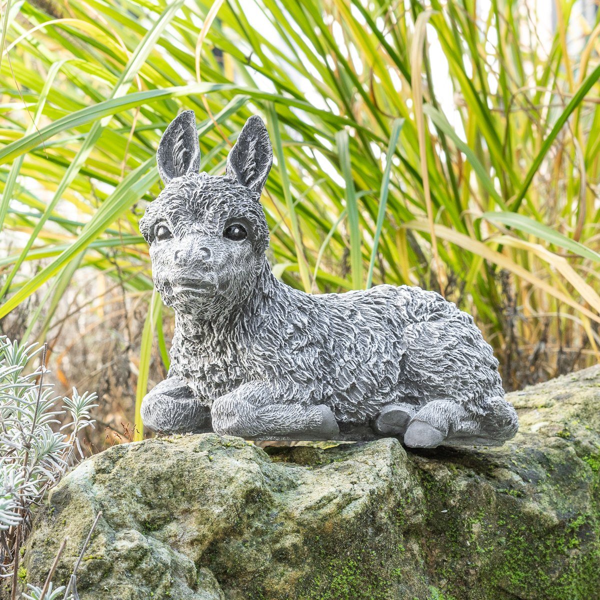 Lieferumfang: 1 Steinfigur, Esel liegend, Steinguss, grau