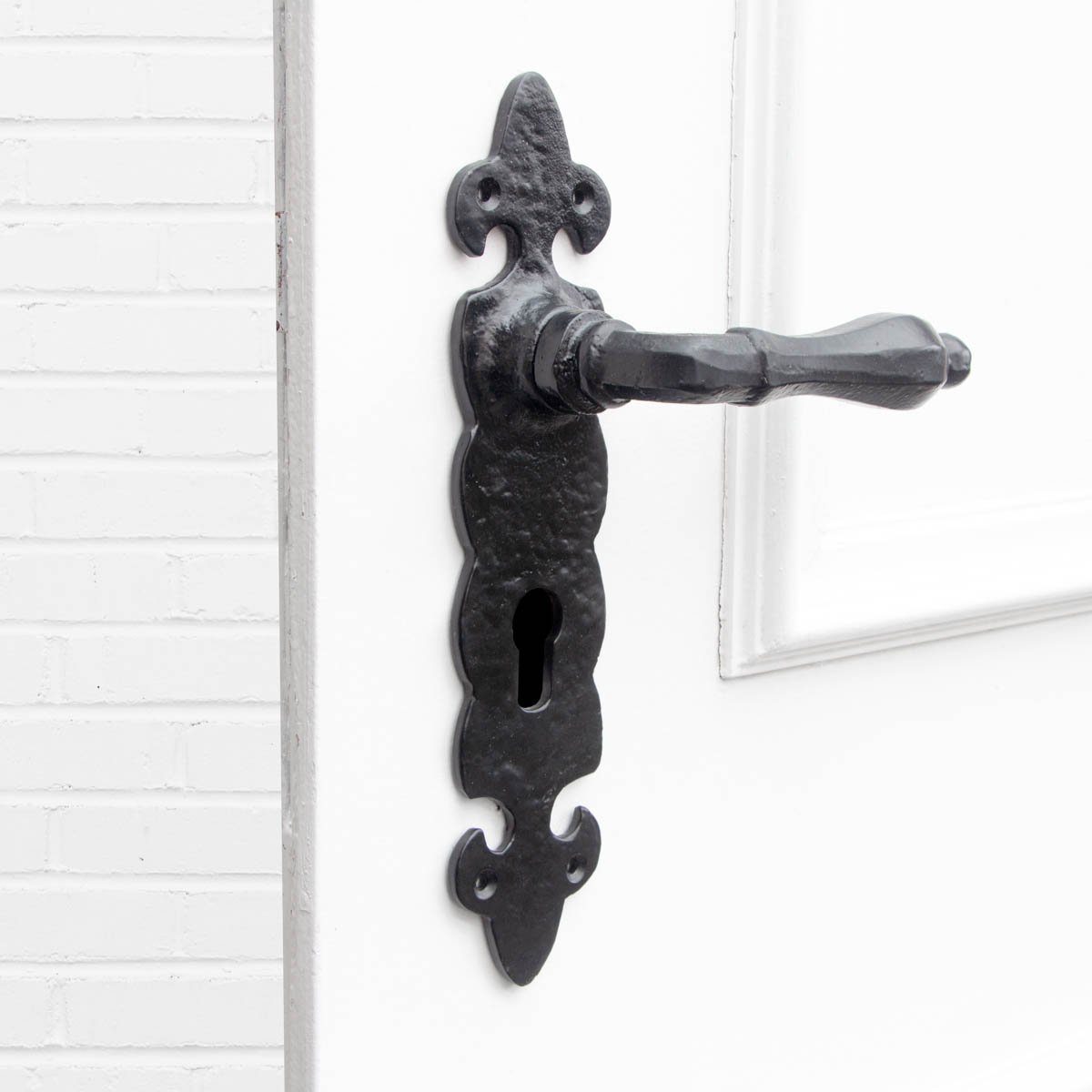 Hochwertig wie antik aus Eisen gearbeitet, haben alle Teile dieser Drückergarnitur eine tiefschwarze Oberfläche, sie sind hochwertig pulverbeschichtet und somit wasserabweisend und rosten nicht. Bestens geeignet zur Bestückung von historischen Eingangstüren.