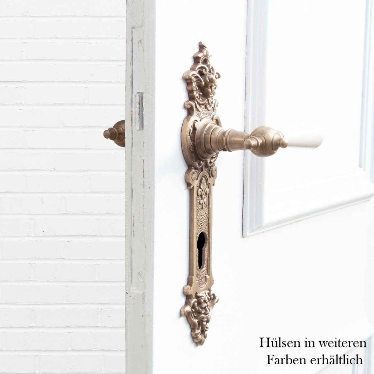 Lieferumfang: 1 Haustür Langschild Drückergarnitur mit Porzellangriffen, bestehend aus 2 Türklinken „Nippon“, 2 Langschildern „Engel“ für die Haustür (PZ92), Messing patiniert, Klinkengriffe in antikweiss