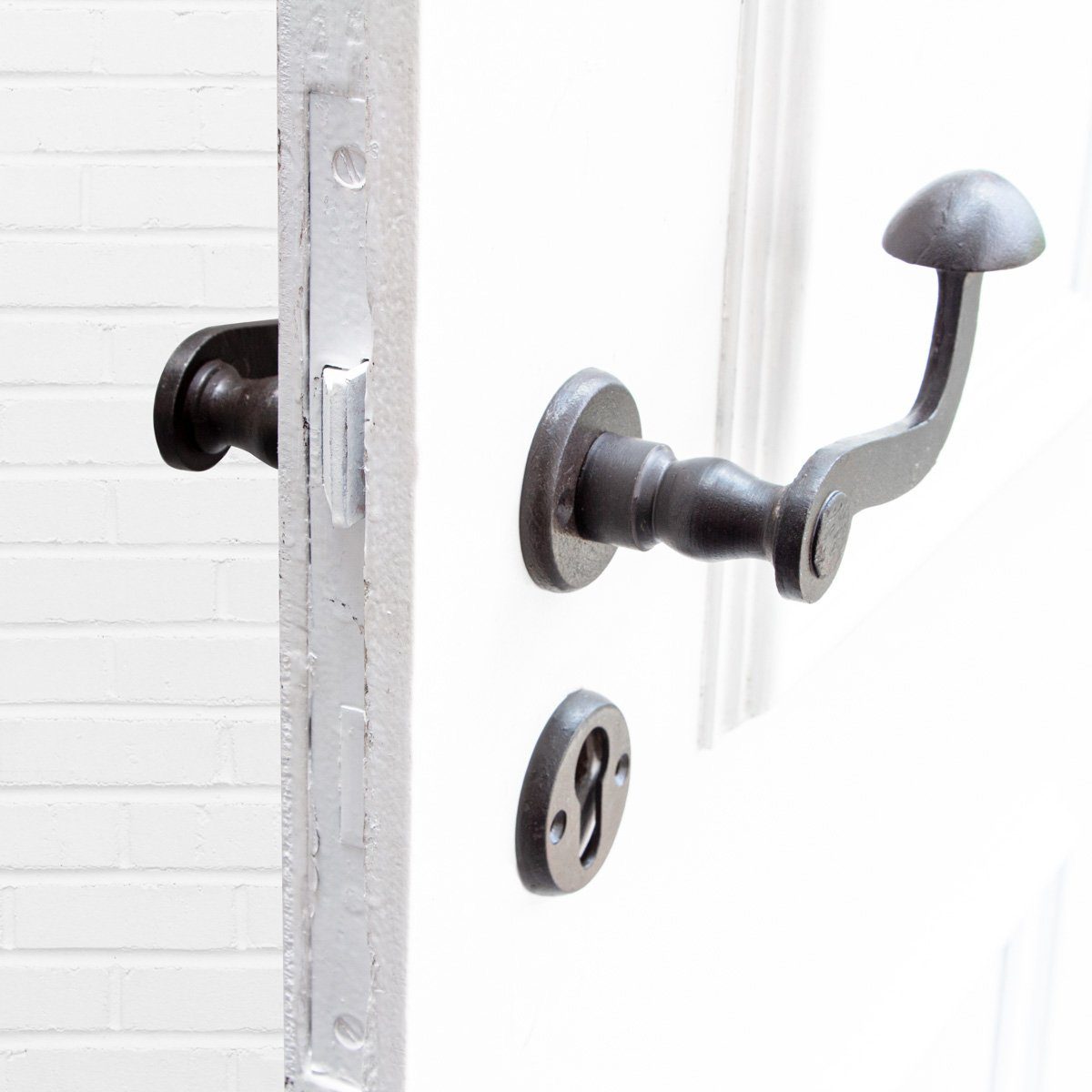 Diese sehr dekorative handgeschmiedete Drückergarnitur - als exklusive Rosetten Garnitur eignet sich hervorragend zum Renovieren historischer Häuser. Die wie antik geschmiedeten Eisen - Türklinken „Knob“ betonen den Antik-Stil eines Landhauses.