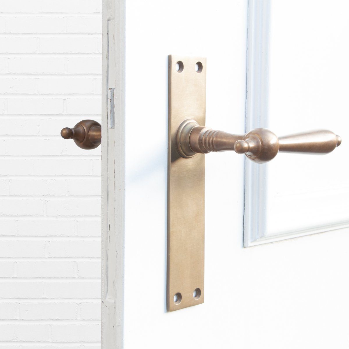 Zwei schöne Türklinken und 2 Langschildern aus patiniertem Messing.