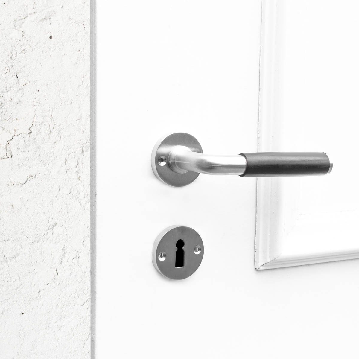 Top Drückergarnitur, schick für Büro-, Geschäfts- und moderne Lebensräume. Eine hochwertige Türklinken Garnitur mit Rosetten in gebürstetem Nickel.
