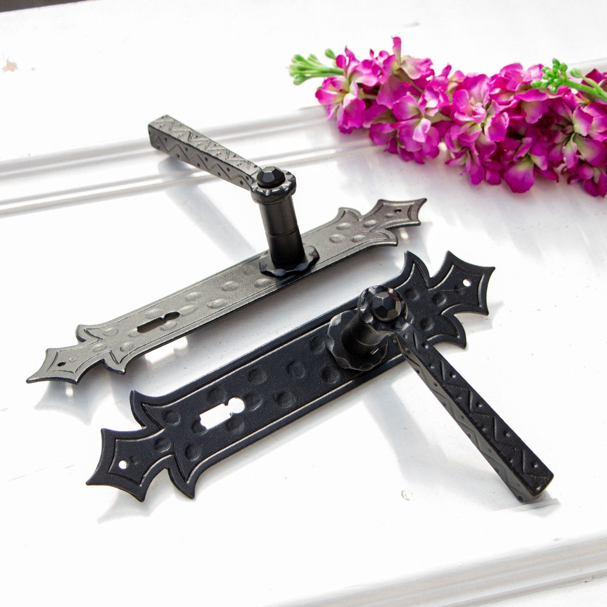 Lieferumfang: 1 Drückergarnitur Schmiedeeisen - Meran - (BB72) bestehend aus: 2 Türklinken und 2 Langschilder, einschl. Dorn und Befestigungsschrauben Material: ASC Antik Schmiedeeisen (Sandgestrahltes Eisen+Verzinkt+ Antik Schwarz matt 140°C und patiniert durch Handarbeit)