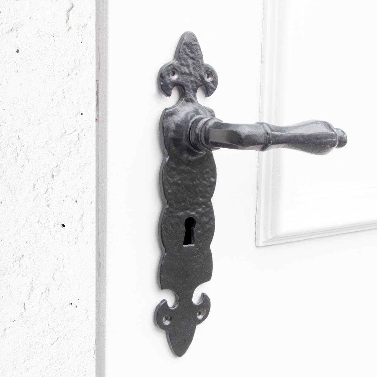 So entsteht diese hochwertige wie antik gearbeitete Zimmertür-Garnitur. Все Teile dieses Sets haben eine tiefschwarze Oberfläche, sie sind hochwertig pulverbeschichtet und somit wasserabweisend und rosten nicht - Bestens geeignet zur Bestückung von historischen Eingangstüren.