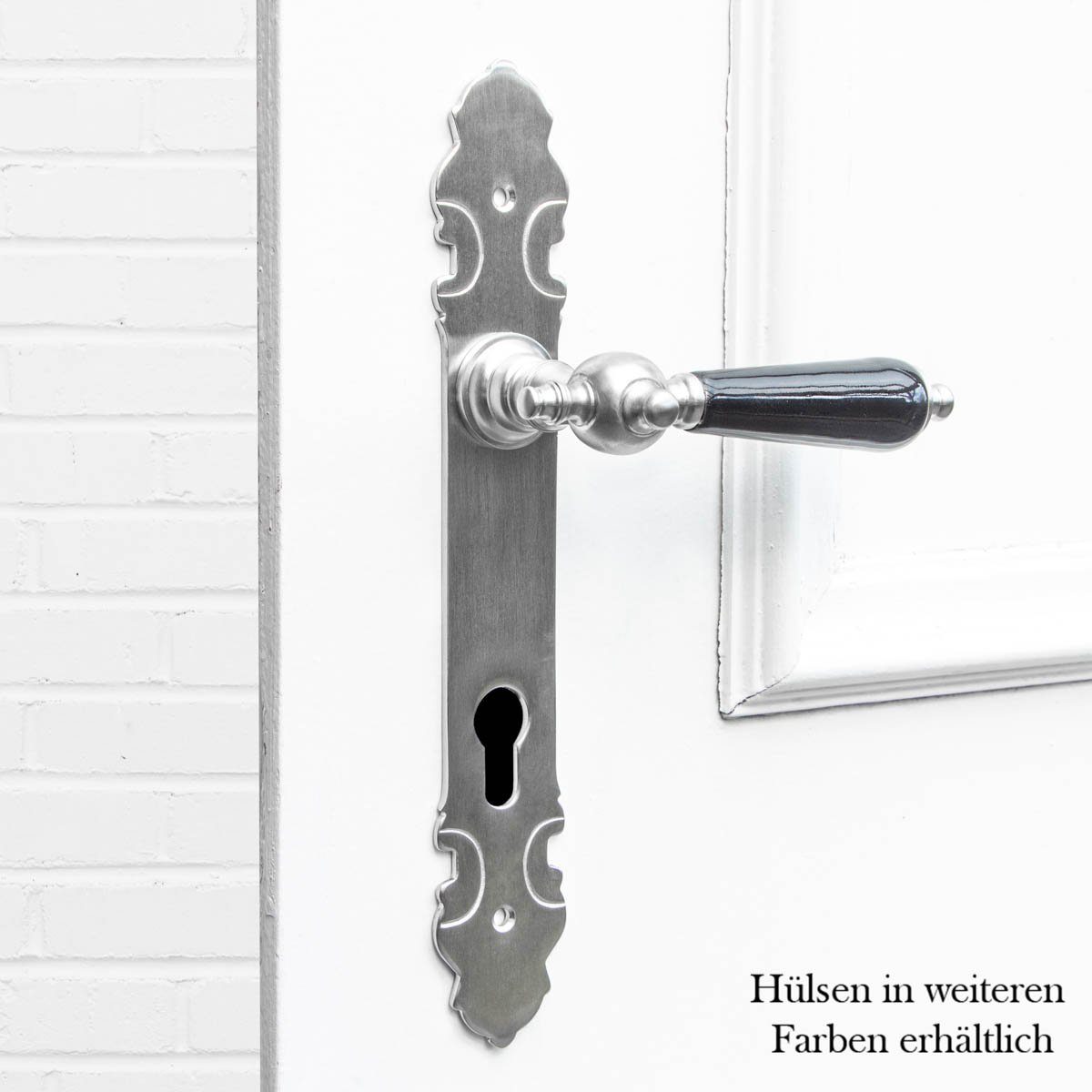 Lieferumfang: 1 Drückerbeschlag für die Haustür, PZ 92, Nickel matt bestehend aus 2 x Langschild + 2 Türklinken (mit schwarzem Porzellangriff), inkl. Dorn/Vierkant (8x8mm)