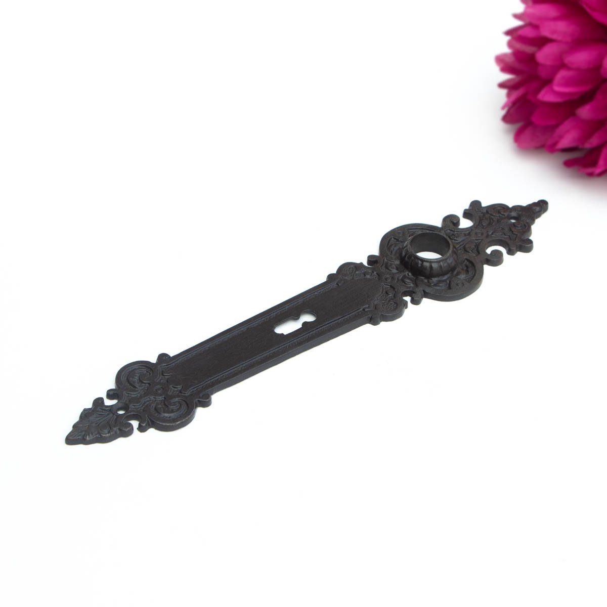 In historischen Gebäuden eine exklusive Vollendung an klassischen Zimmertüren: Ein wunderbares Langschild aus Eisen mit hochwertiger antikbrauner Farbe.