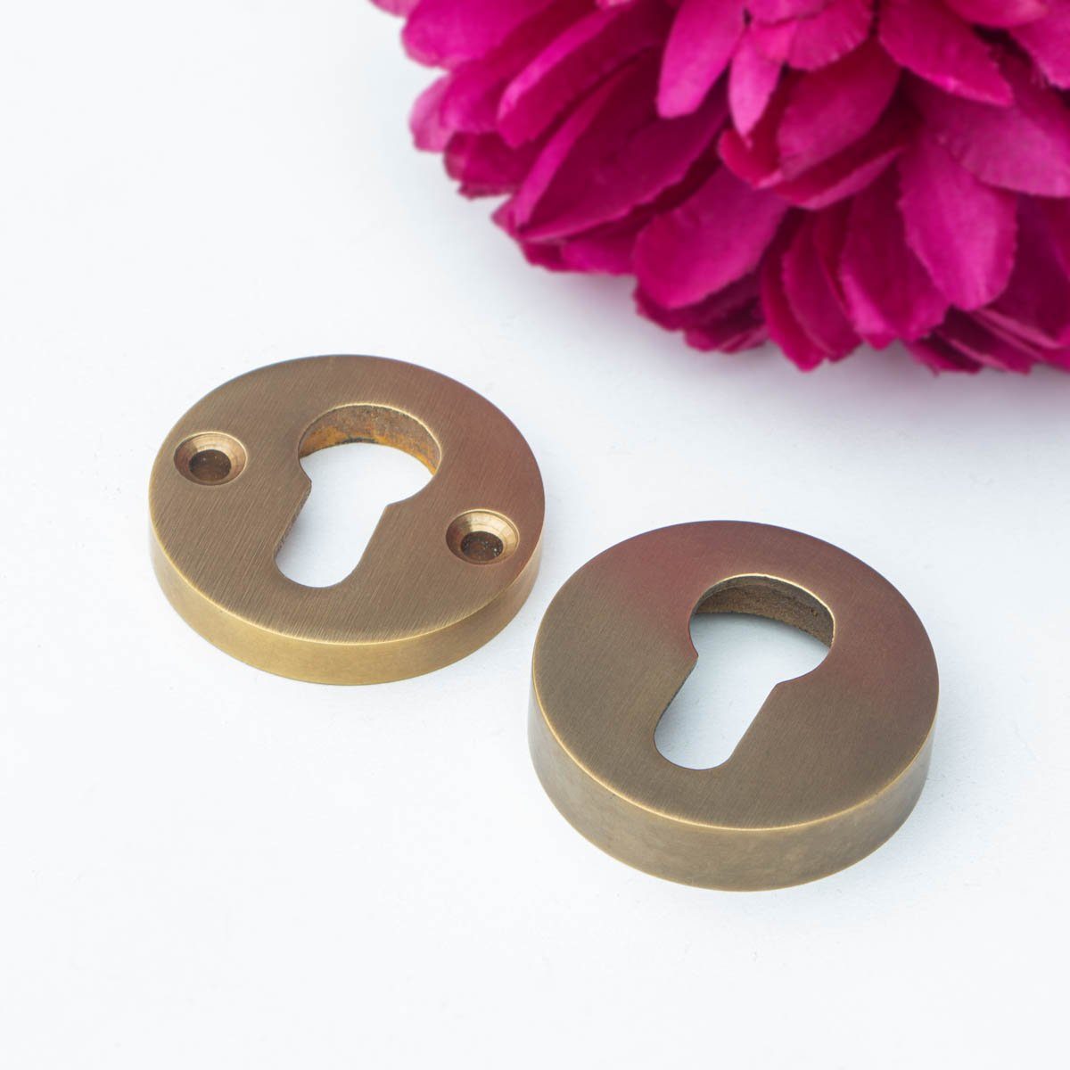 Eine wie antik erscheinende, sehr hochwertige Sicherheits-Rosette. Die aus Messing patiniert gearbeitete Schloss-Rosette passt sehr gut zu vielen antiken Haustür Türbeschlägen.