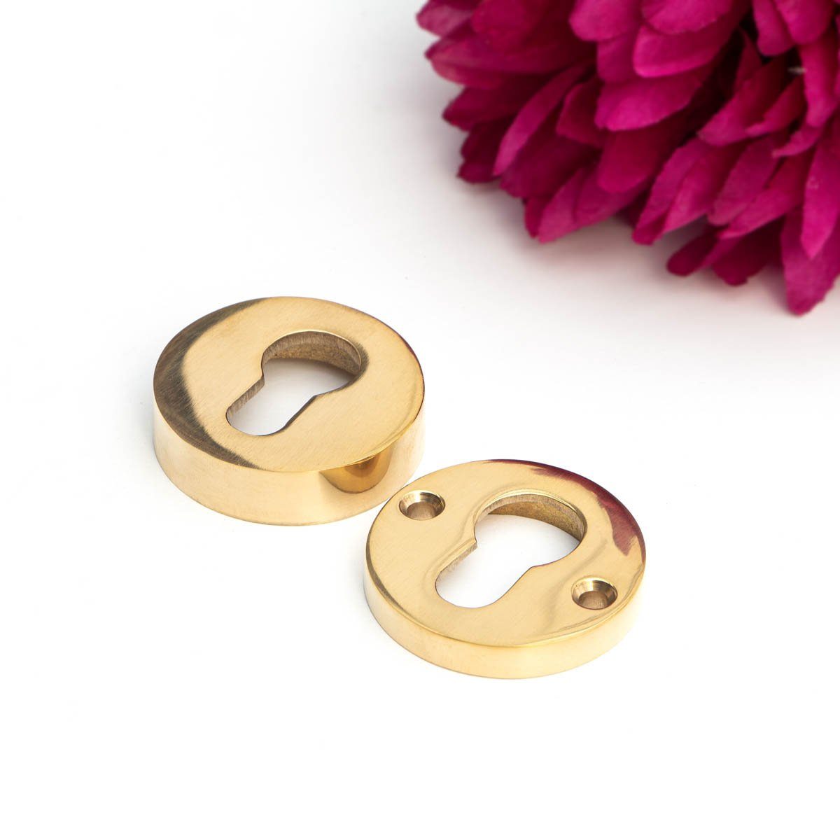 Eine Sicherheits-Rosette aus poliertem Messing für Türen mit Profilzylinder.