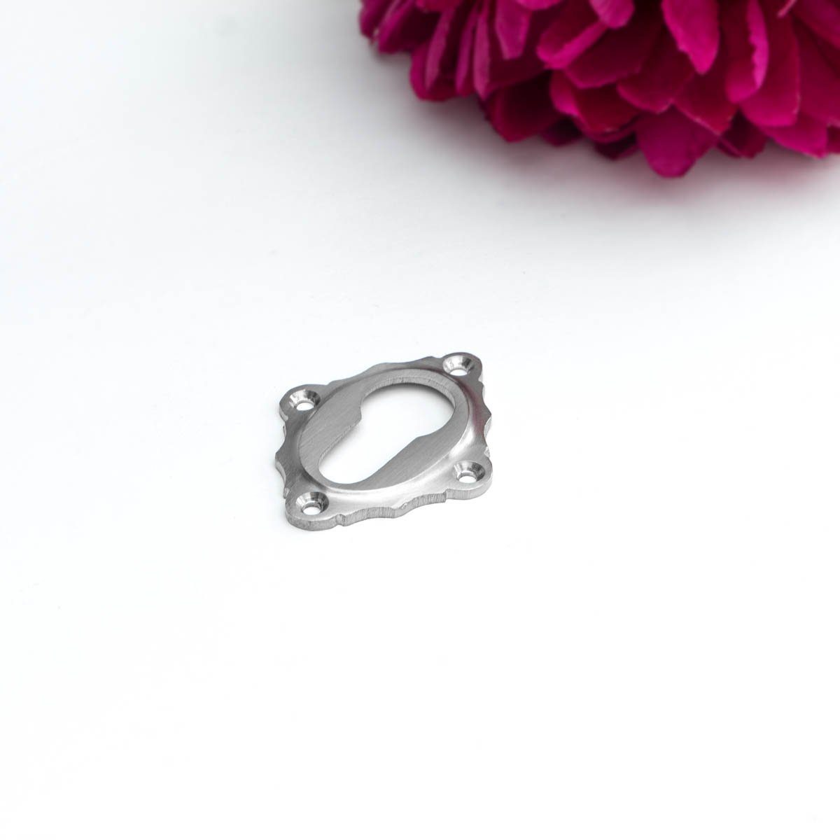 Eine hübsche Rosette in matten Nickel , wie aus historischen Zeiten. Ideal für die Renovierung für historische Türen mit neuem Schlosssystem oder für die Aufwertung neuerer Eingangstüren.