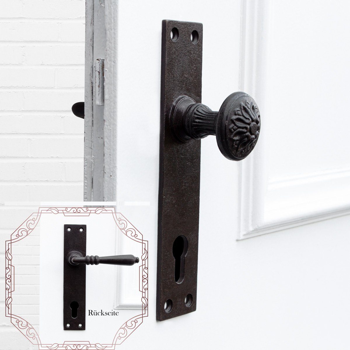 Ein Türbeschlag in Antik Eisen - Langschild Abdeckung mit Klinken und kleinem Knauf als Haustür - Oder Nebeneingangsbeschlag.