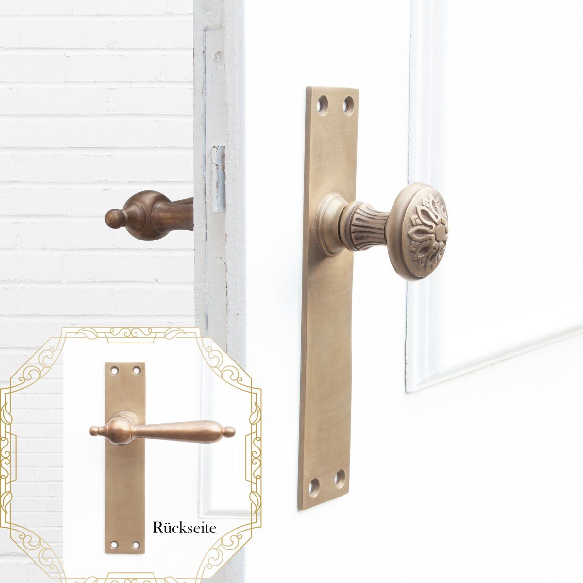 Ein schöner Türknauf, eine Türklinke und 2 Langschildern aus patiniertem Messing. Die wie Antik gefertigten Langschilder sind besonders da sie "KEIN" Schlüsseloch haben.
