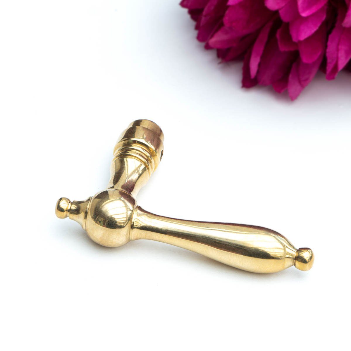 Eine wie historisch gefertigte Türklinke aus schönem Messing poliert. Dieser Türdrücker ist eine perfekte Antik-Nachfertigung und eignet sich ideal, sowohl für neue, als auch für antike Türen.