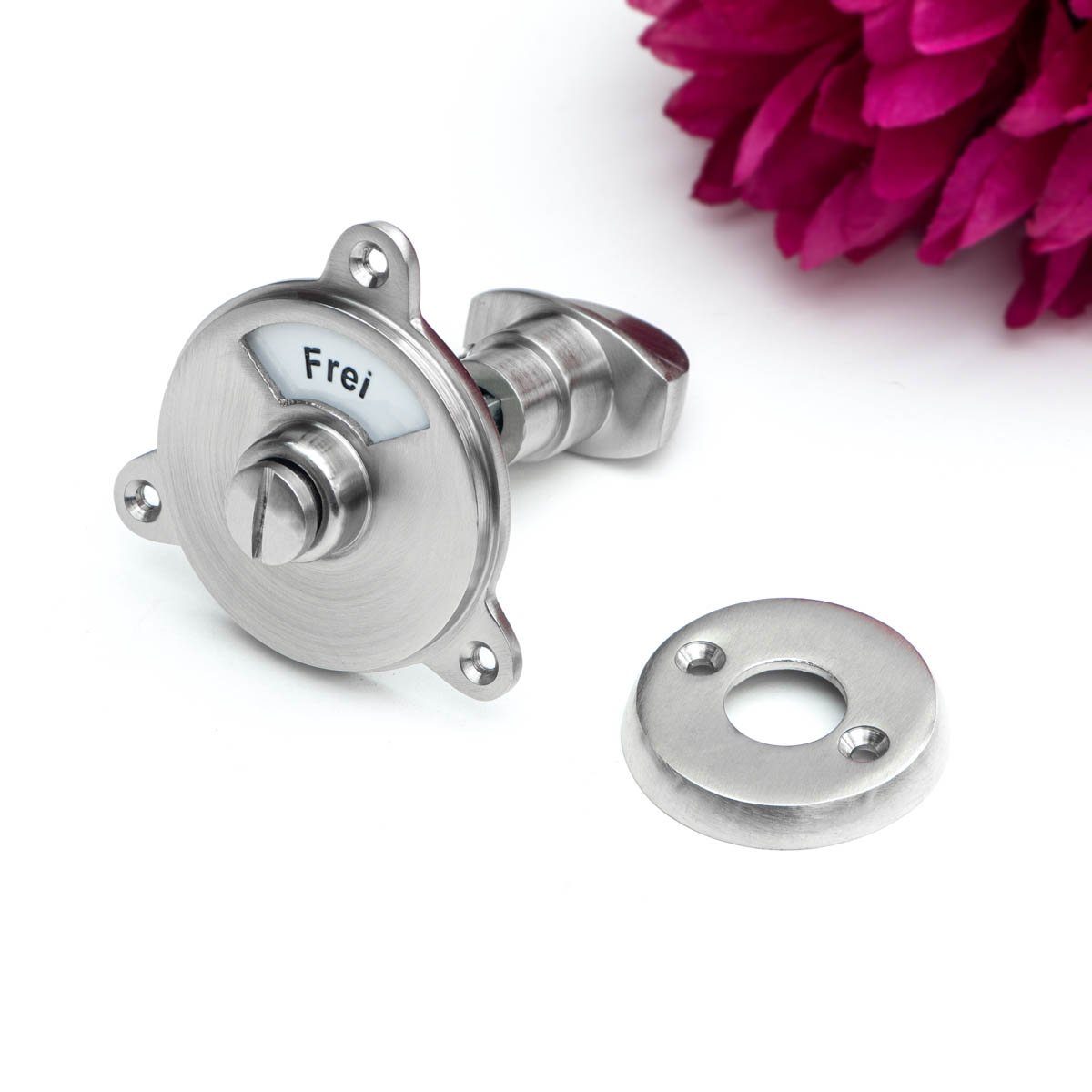 Lieferumfang: 1 WC-Türbeschlag für Toilettentür, Nickel gebürstet , bestehend aus: 1 Front-Element mit emaillierte Scheibe mit der Aufschrift: besetzt und frei, 1 Rückwärtiger Drehknauf, 1 Rosette für Drehknauf, 1 Dorn