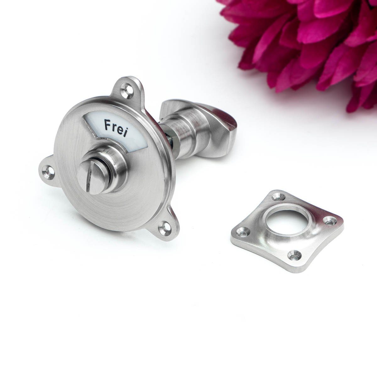 Lieferumfang: 1 Toilettenschließer als Drehverschluss mit Rosette, Nickel gebürstet bestehend aus: 1 Front-Element mit emaillierte Scheibe mit der Aufschrift: besetzt und frei, 1 Rückwärtiger Drehknauf, 1 Knaufrosette, 1 Dorn