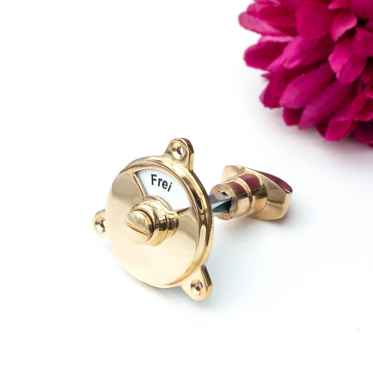 Ein sehr edel gefertigter Türverschluss in Messing glänzend mit Rosette und Emaille-Schild für besetzt und frei. Dieser Landhausverschluss, welcher auch in ein modernes Ambiente passt, ist ein wirklich gediegener Türbeschlag und als Drehverschluss sehr ansprechend!