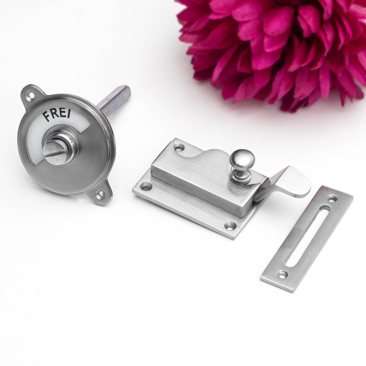 Maße ca. : Runde Platte: Durchmesser: 6 cm (Beschriftung der Emaille-Drehscheibe: " FREI - BESETZT ") Verschluss-Teil: Br 7 cm x 5,1 cm, plus Verriegelung 2,5 cm, Türblatt-Abstand 2,5 cm Schnapper: 8,5 cm x 2,1 cm