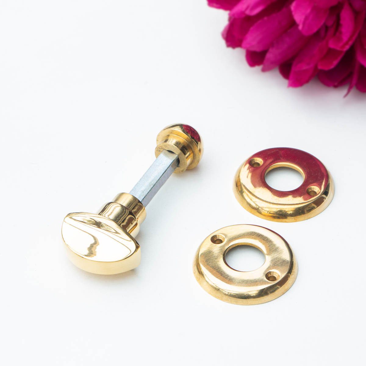 Ein geschmackvoller Türbeschlag für die Toiletten-Türen im Landhaus und ein stilvoll eingerichtetesAmbiente: Dieser Toilettenverschluss ist für eine Badezimmer- oder WC Tür hochwertig und schön aus Messing gearbeitet.