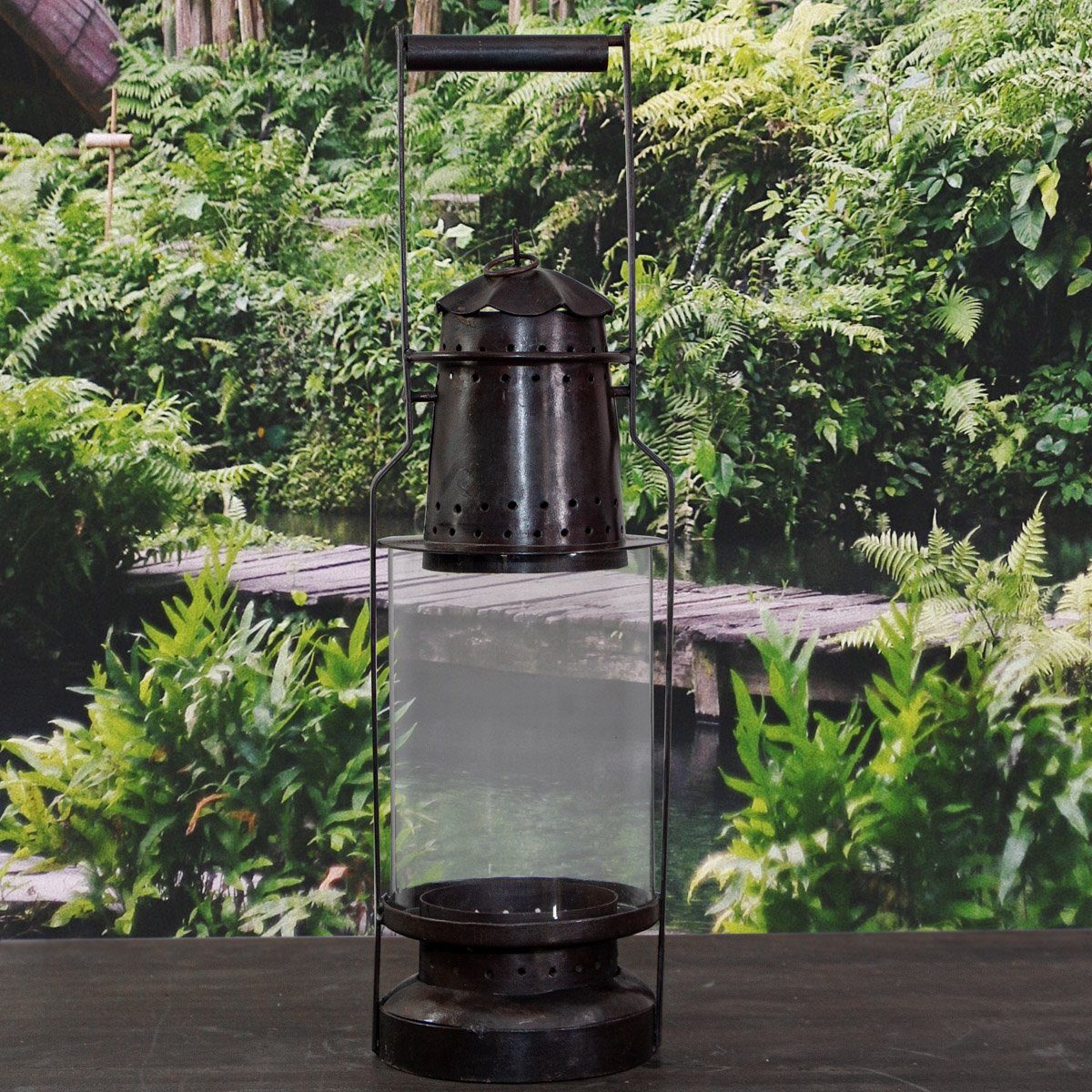 Eine rustikale Laterne aus Metall in Form einer Öllampe.