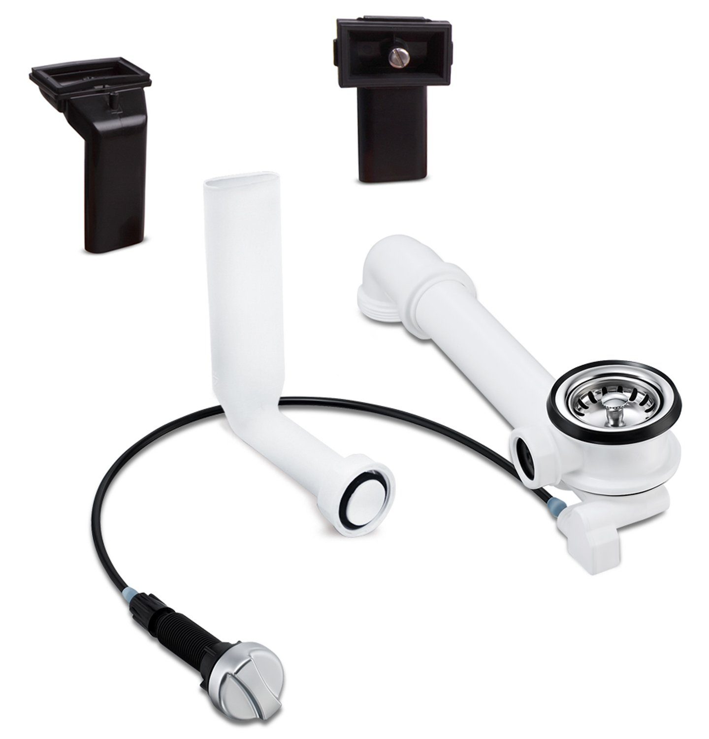 Lieferumfang: • Drehexzenter-Ventil 1,5 Zoll / Durchmesser 70 mm, mit einem 1 Zoll Schraub-Anschluss für den Überlauf • 1 Siebkörbchen herausnehmbar, Durchmesser ca. 81 mm • Exzenter-Bedienelement mit Bowdenzug ca. 50 cm • Ventil-Drehknopf/Bedienknopf • Dichtungen für Ventil und alle Rohrverbindungen • Hohlschraube ca. 25 mm mit Schraub- und Montagehilfen • Raumsparrer/Ablauf-Rohr (100-280 mm) mit 90° Bogen und Verbinder, beliebig kürzbar, da einseitig gesteckt • Überlauf-Winkel-Rohr mit Befestigungsschraube: Durchmesser 25 mm und 140 mm lang • Überlauf flach mit Dichtung R480 rechteckig • Überlauf flach für Abtropfschale, inkl. Dichtung