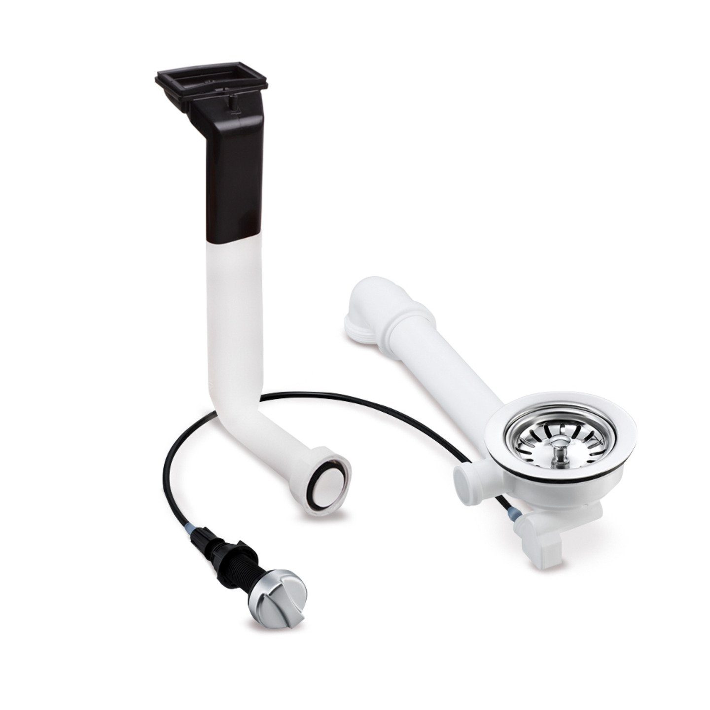 Das 3 1/2 Zoll große Siebkorbventil besitzt ein herausnehmbares Siebkörbchen. Dieser Ablauf besitzt ein Excenterventil, das mit einer Drehbetätigung bedient wird. Der Geruchsverschluss kann einfach flach an der Wand ausgeführt werden. So kann auch in kleineren Unterschränken beispielsweise noch ein Abfalltrennsystem eingebaut werden.