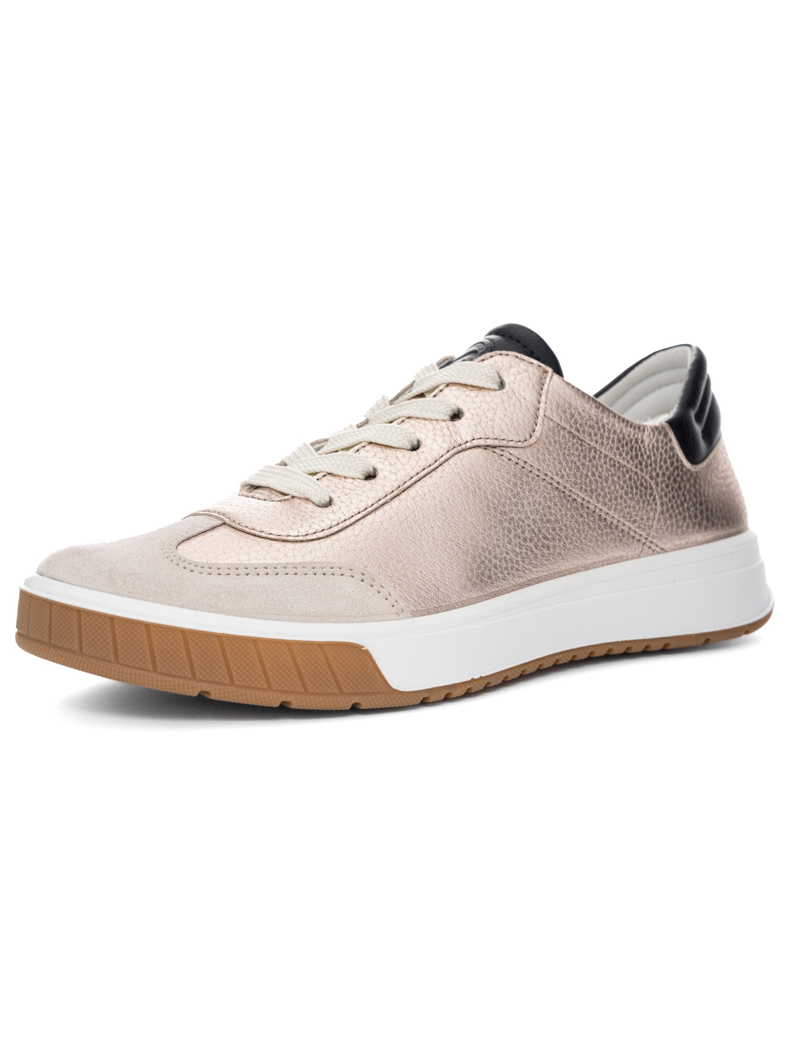 Dieser leichte Sneaker vereint angesagten Look mit hohem Tragekomfort und ist perfekt für alle, die Stil und Bequemlichkeit schätzen. Aus weichem Leder gefertigt, schmiegt sich das Obermaterial angenehm an den Fuß und verleiht dem Schuh eine edle, lässige Note. Für eine optimale Anpassung sorgen die Schnürung sowie ein seitlicher Reißverschluss, der das An- und Ausziehen zum Kinderspiel macht. Das weich gepolsterte Wechselfußbett, mit Frottee überzogen, bietet auch an langen Tagen besten Komfort. Die innovative High Soft Technologie kombiniert superweiches Leder mit einer hochflexiblen Laufsohle, was für eine perfekte Passform und eine sanfte Dämpfung sorgt. Das atmungsaktive Frottee-Innenfutter aus Bambusmaterial absorbiert Feuchtigkeit und schafft so ein frisches, angenehmes Fußklima. Dank der weichen Rundumpolsterung werden Druckstellen zuverlässig vermieden. Die sportliche Keilsohle mit rutschhemmendem Profil sorgt zudem für sicheren Halt und macht diesen Schuh zum idealen Begleiter für den Alltag. Leicht, trendig und bequem – dieser Sneaker ist ein echtes Must-have.