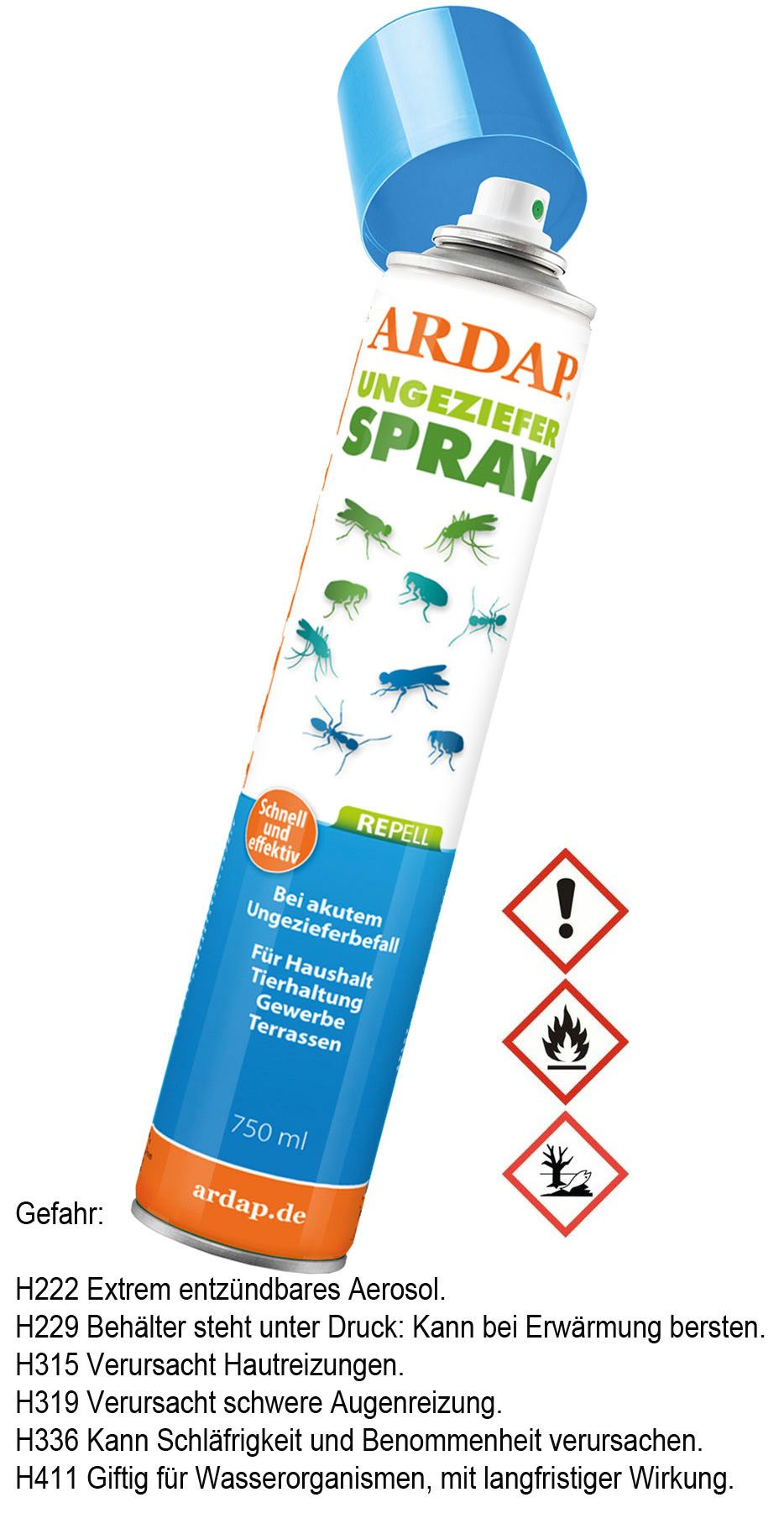 Universalpräparat zur Abwehr von Fliegen und anderem Ungeziefer. Das ARDAP Ungezieferspray mit den Wirkstoffen Pyrethrum aus der Chrysantheme und Geraniol ist ein repellierendes Hilfsmittel zur Abwehr von Ungeziefer wie Ameisen, Fliegen, Flöhe, Spinnen, Silberfischchen und Milben in Haushalt, Gewerbe und Tierhaltung.