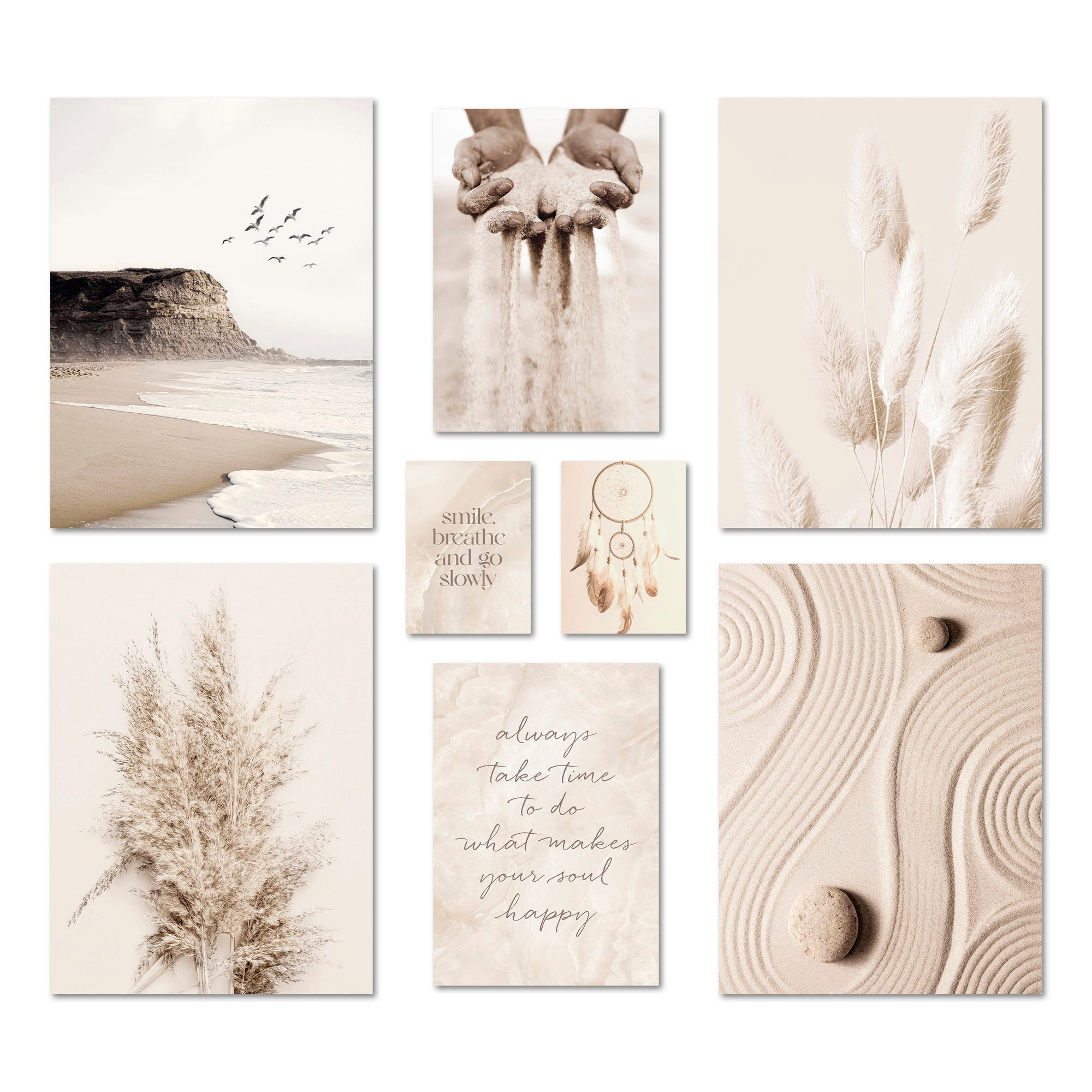 Tauche ein in die emotionale Welt dieses faszinierenden Bilder-Sets. Die getrockneten Schilfhalme und das samtige Gras erzeugen eine natürliche und beruhigende Atmosphäre. Die Küstenlandschaft mit den Möwen versetzt dich direkt ans Meer und lässt dich die Freiheit der Weite spüren. Die Aufnahme der Hände, die den Sand durch die Finger rieseln lassen, symbolisiert das Loslassen und den Genuss des Augenblicks. Die Nahaufnahme des Traumfängers fängt die Träume und Sehnsüchte ein und erinnert dich daran, an deine Ziele zu glauben. Die Steine mit den Kreisformen im Sand repräsentieren Harmonie und Gleichgewicht. Die Zitate-Poster mit den inspirierenden Sprüchen "Always take time to do what makes your soul happy" und "Smile, breathe and go slowly" ermutigen dich, auf dein inneres Glück zu achten und das Leben bewusst zu genießen. Dieses Bilder-Set lässt dich in eine Welt der Ruhe, Inspiration und positiver Energie eintauchen und erinnert dich daran, den Moment zu schätzen und deiner Seele Gutes zu tun.