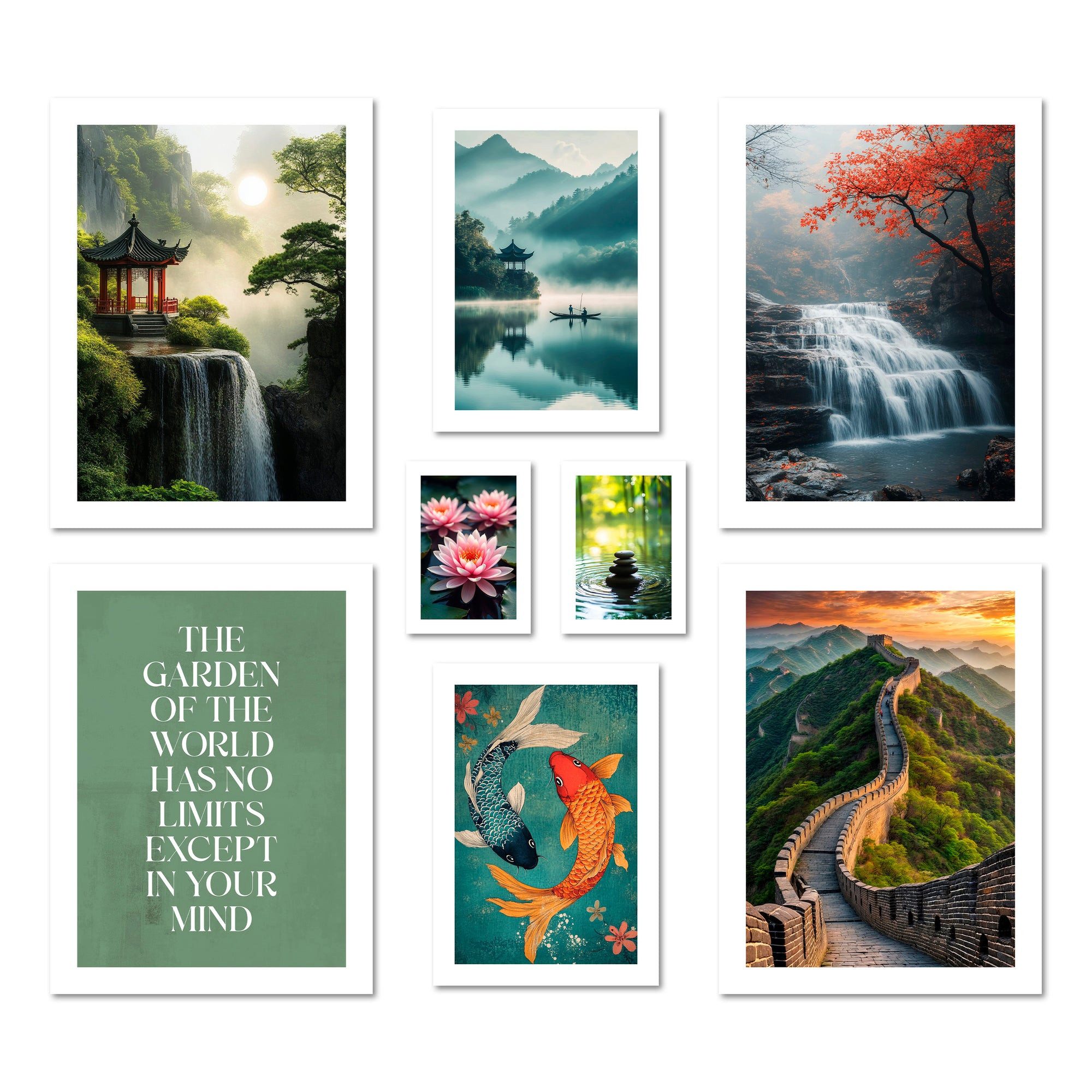 Bringe Harmonie, Ruhe und natürliche Balance in dein Zuhause mit dem Poster Set "Feng Shui". In sanften und zugleich kraftvollen Grün, Rot und Blau gehalten, entfalten die acht kunstvoll gestalteten Poster eine wohltuende Atmosphäre. Chinesische Pavillons inmitten üppiger Natur, majestätische Wasserfälle, stille Seen mit Anglerboot, elegante Kois in Yin Yang Form und zarte Seerosen laden dazu ein, die Energie des Raumes neu fließen zu lassen. Ergänzt wird das Set durch die eindrucksvolle Darstellung der chinesischen Mauer und die inspirierende Typografie "The garden of the world has no limits except in your mind". Ob im Wohnzimmer, Schlafzimmer, Flur oder Meditationsraum, diese Feng Shui Poster schaffen einen Ort der Gelassenheit und stärken das emotionale Wohlbefinden im Einklang mit der fernöstlichen Lebenskunst.