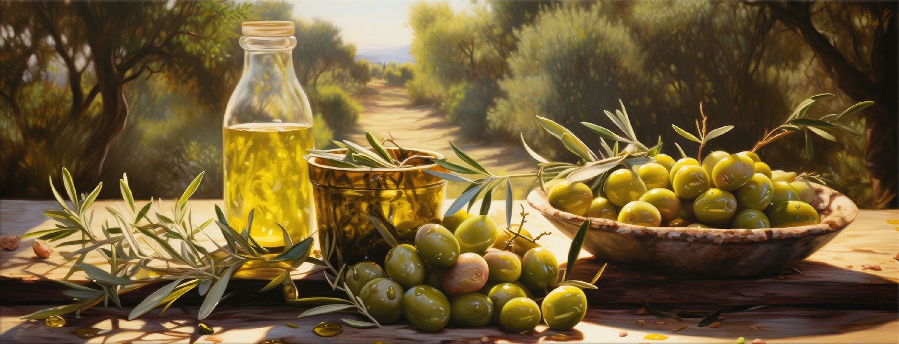 Das rustikale Küchenbild zeigt verschiedene gemalte mediterane Speisen wie z.B Oliven und Olivenöl. Das dekorative Bild passt besonders gut zu Einrichtungen sowie Küchen-Deko in den Farben Braun, Beige und Grün.