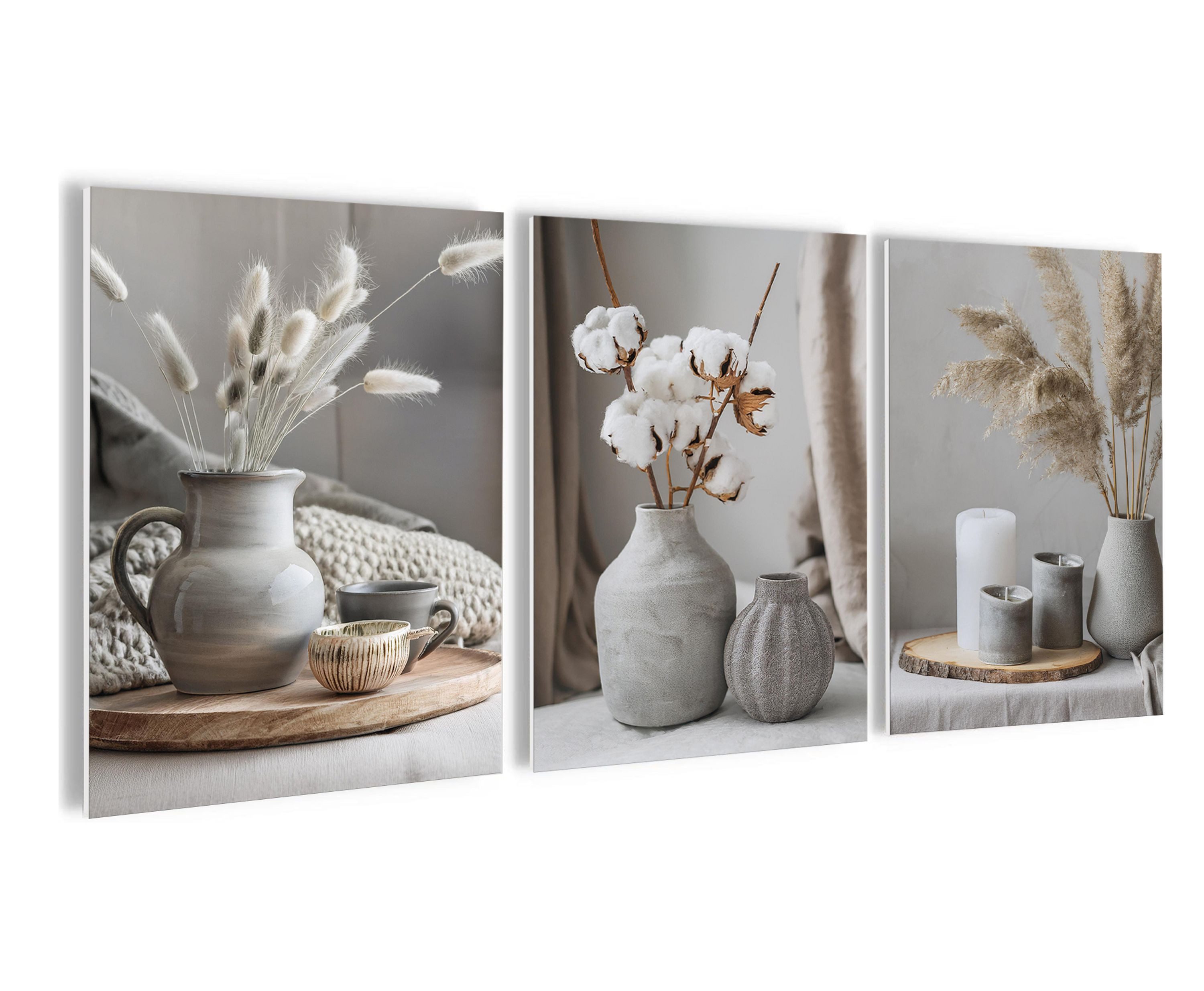 Das Set umfasst drei verschiedene moderne Fotografien, die stilvolle Stillleben mit Gräsern zeigen. Die harmonische Farbgestaltung im Boho- und Landhausstil schafft eine natürliche und beruhigende Atmosphäre. Dank der zeitlosen Motive lassen sich die Bilder ideal in unterschiedliche Wohn- und Geschäftsräume integrieren.