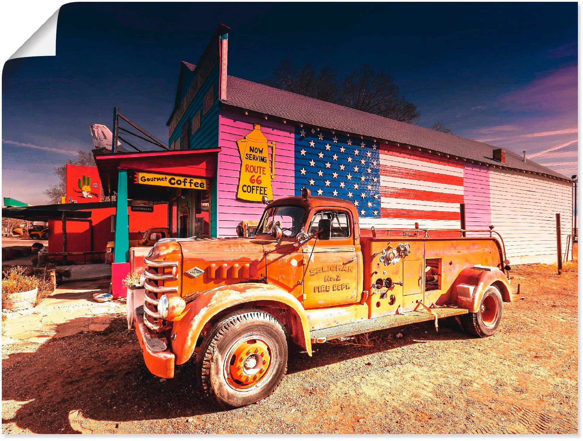 Unser mit Liebe in Handarbeit hergestelltes Wandbild mit dem Motiv Feuerwehr Oldtimer in Kingman / Seligman von Kurt Krause überzeugt durch originalgetreue Druckqualität und hochwertige Basismaterialen. Das Motiv wird Dir wie abgebildet und fertig zum Aufhängen nach Hause geliefert.