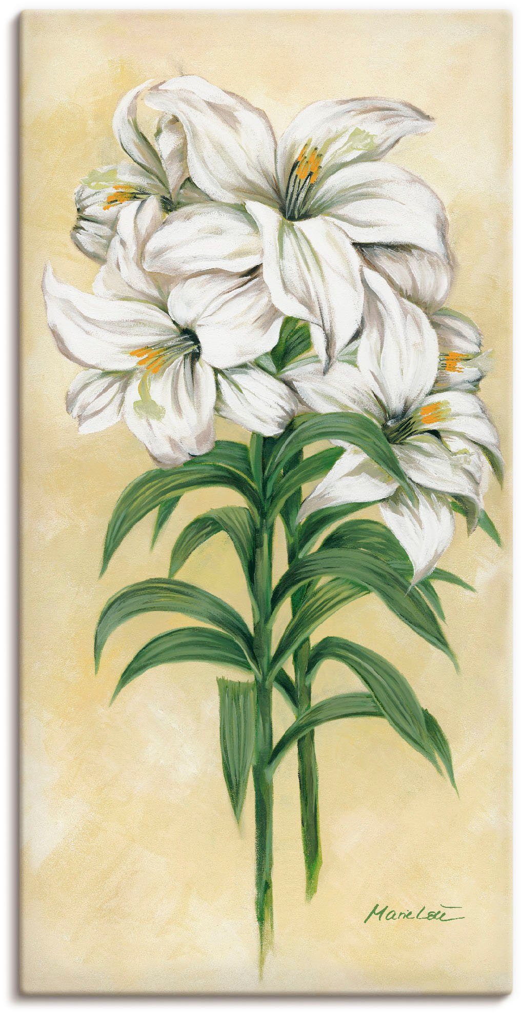 Unser mit Liebe in Handarbeit hergestelltes Wandbild mit dem Motiv Lilien von Marie Lou überzeugt durch originalgetreue Druckqualität und hochwertige Basismaterialen. Das Motiv wird Dir wie abgebildet und fertig zum Aufhängen nach Hause geliefert.